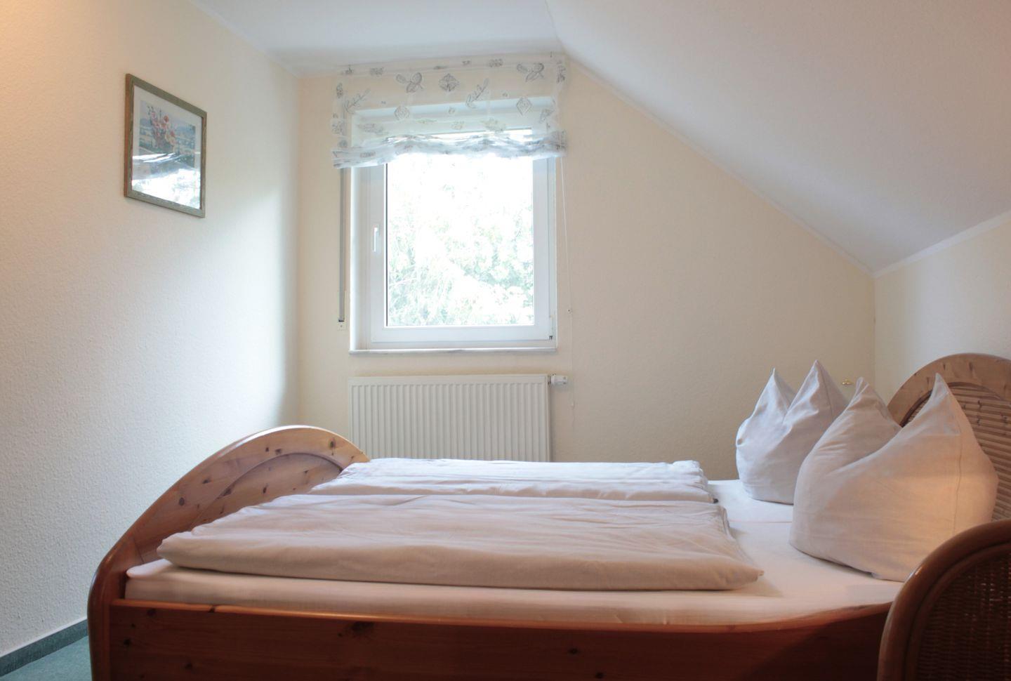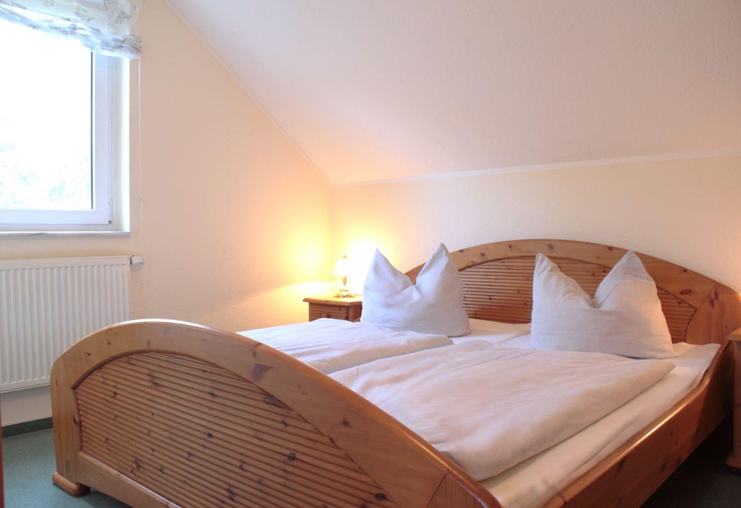 Über eine Treppe gelangen Sie in die obere Etage des Hauses, wo sich zwei separate Schlafzimmer und das Badezimmer befinden. Die Schlafräume sind entweder mit einem Doppelbett oder zwei Einzelbetten und einem Kleiderschrank bzw. einer Kommode möbliert.
