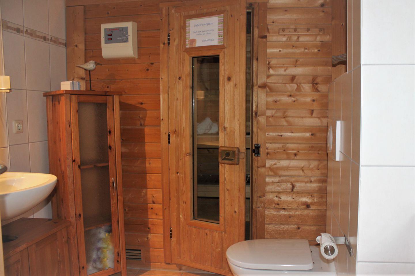 Das Badezimmer ist mit einer Dusche, einem Waschtisch, WC und einer Sauna ausgestattet. In der Nebensaison relaxen Sie hier nach einem langen Spaziergang am Strand. Ein zusätzliches Gästebadezimmer mit Waschtisch und WC runden das Angebot des Ferienhauses ab.