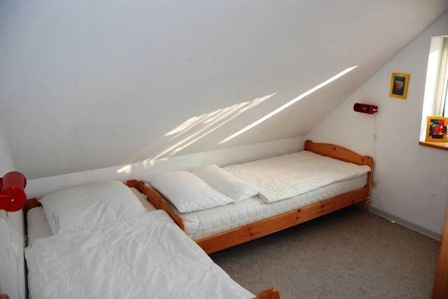 Über eine Treppe gelangen Sie in das Obergeschoss des Hauses. Hier befinden sich die zwei weiteren Schlafräume, die entweder mit einem Doppelbett oder zwei Einzelbetten und jeweils Stauraum für Ihre Garderobe möbliert sind. Für die Kleinsten gibt es Spielzeug, Bücher und einen Hochstuhl.
