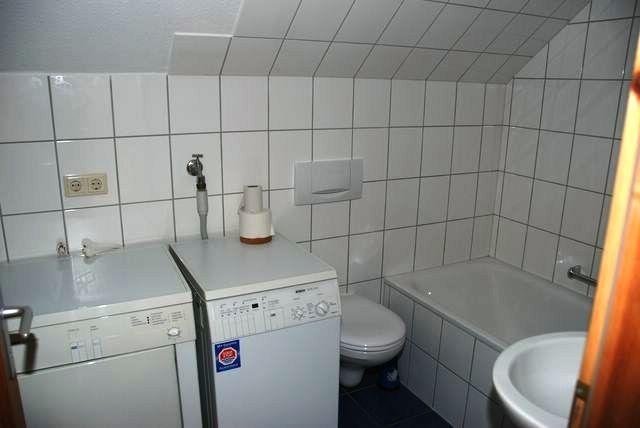 Das Ferienhaus bietet Ihnen zudem zwei Badezimmer mit Fenster. Das Bad im Erdgeschoss des Hauses verfügt über eine Dusche, Waschtisch, WC, Urinal und Handtuchheizkörper. Das Bad im Obergeschoss bietet eine Badewanne, Waschtisch, WC, eine Waschmaschine und einen Trockner.