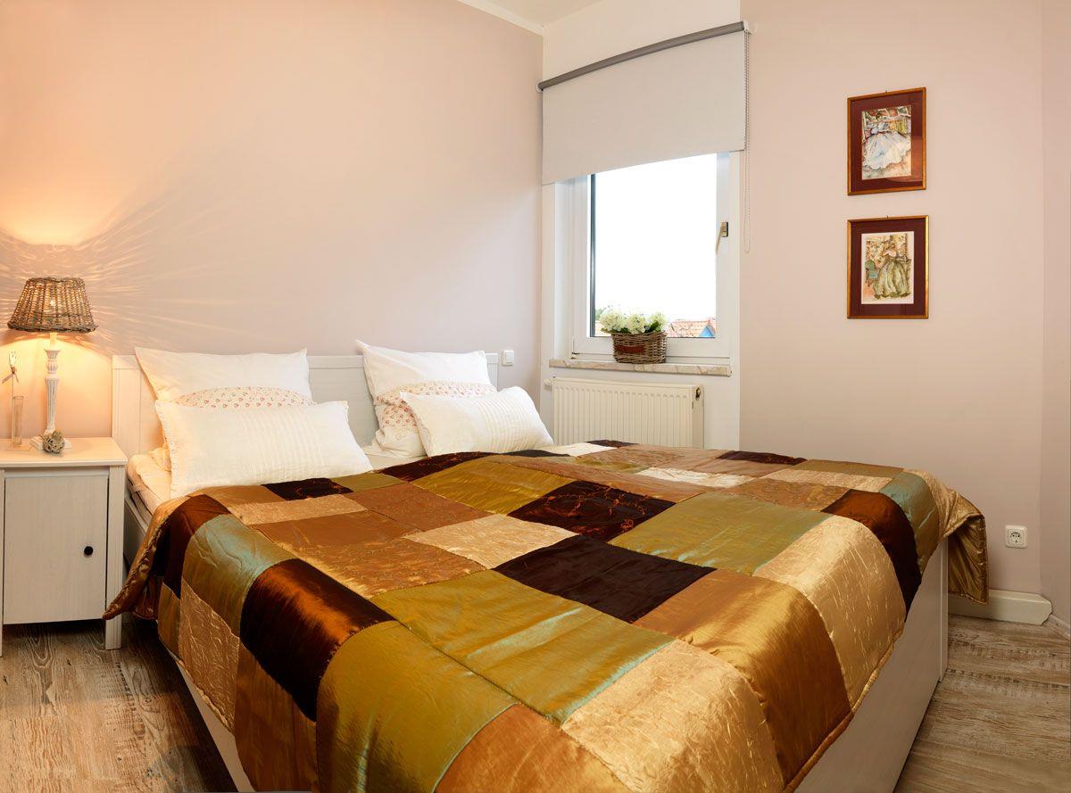Das separate Schlafzimmer ist mit einem Doppelbett (160x200cm, getrennte Matratzen) und einem Kleiderschrank ausgestattet. Eine weitere Person findet auf dem komfortablen Sofa mit Schlaffunktion (80x200cm Liegefläche) einen angenehmen Schlafplatz.