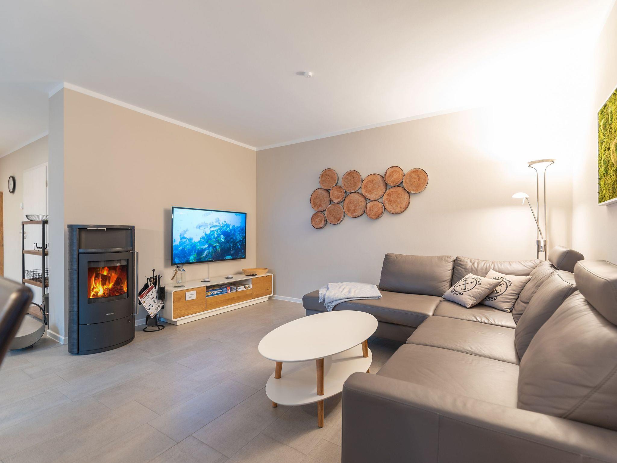 • großer Wohnraum mit gemütlicher Eckcouch und Kamin