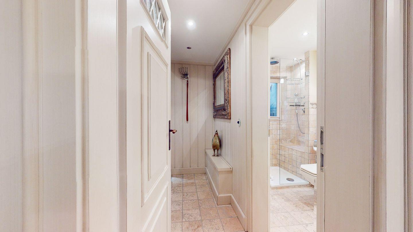 Das Badezimmer besticht durch sein helles Duschbad mit ausreichend Stauraum und Tageslichtschacht und wunderschönen Natursteinfließen.