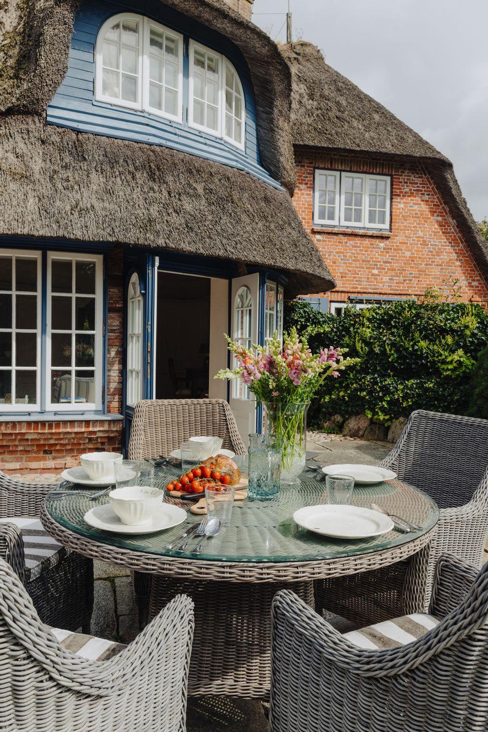 Die Terrasse ist der perfekte Ort, um ungestörte Stunden im Freien zu verbringen, umgeben von üppigem Grün, das einen privaten Rückzugsort auf Sylt schafft.