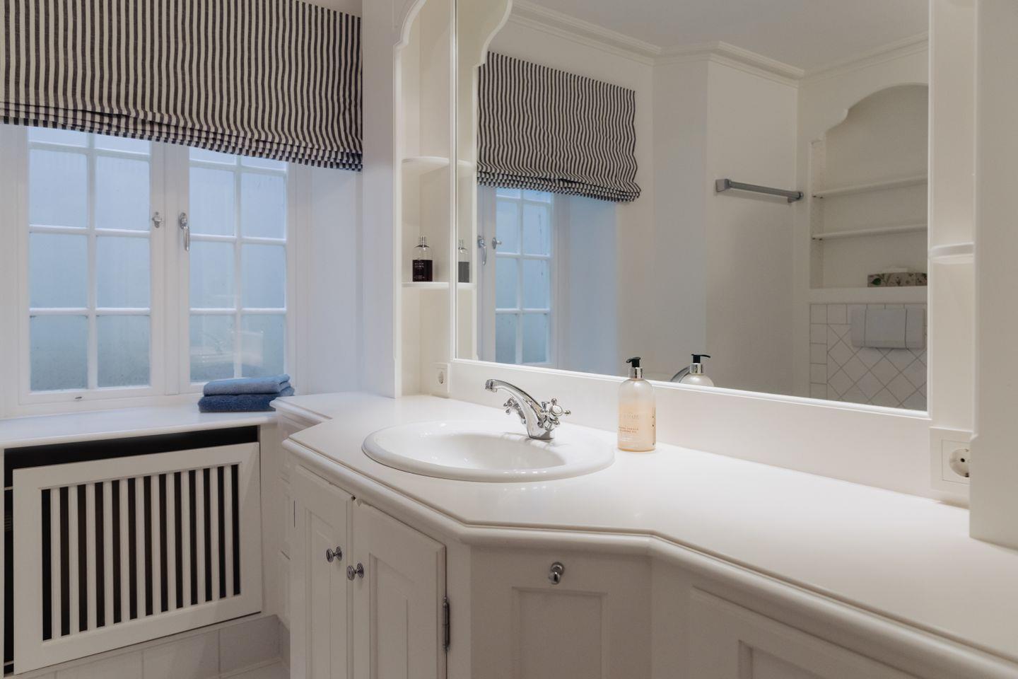 Eines der Badezimmer verfügt über eine großzügige Badewanne, die zum Relaxen bei Kerzenschein einlädt, umgeben von der einzigartigen Ästhetik der friesischen Kacheln.