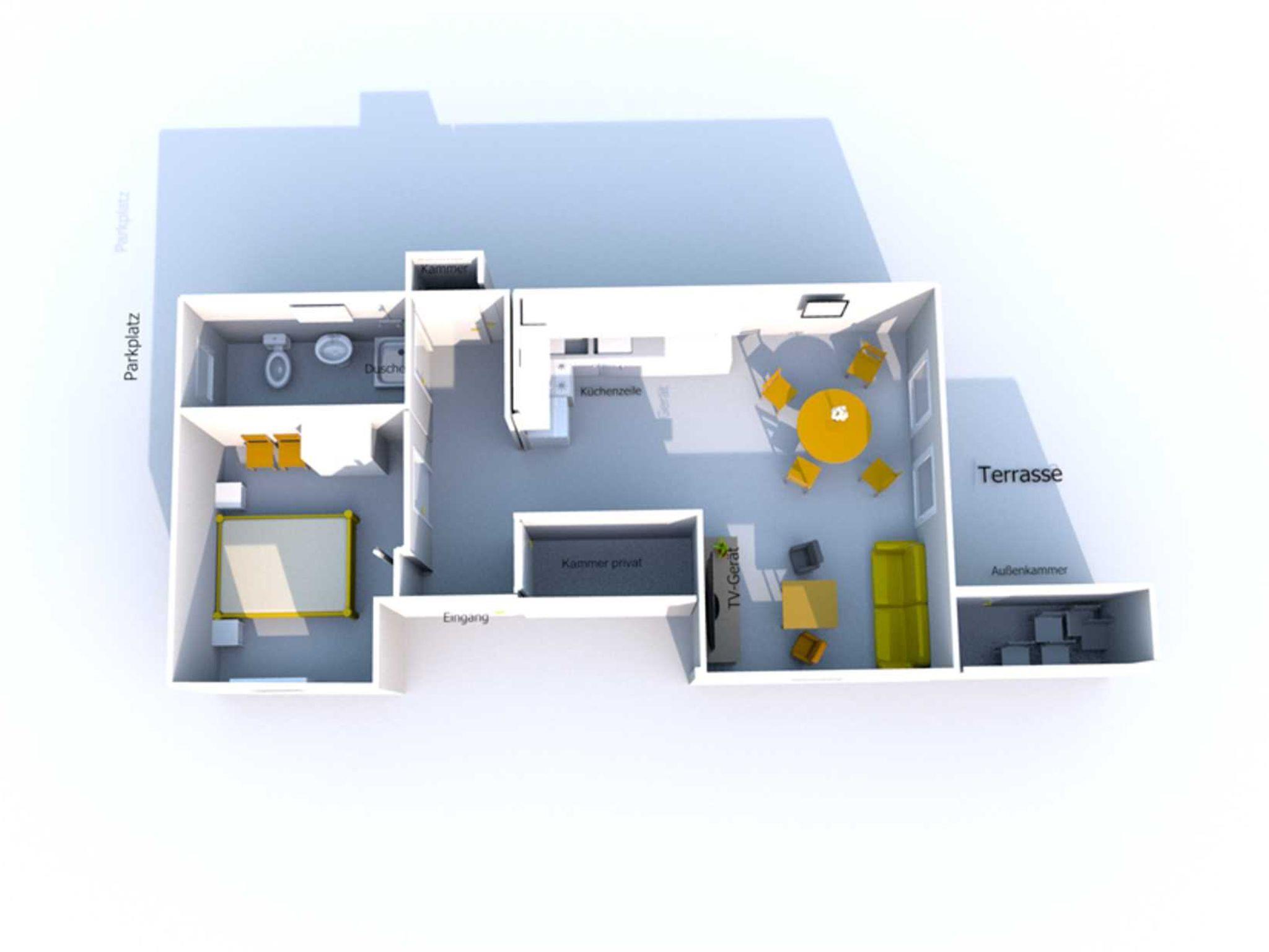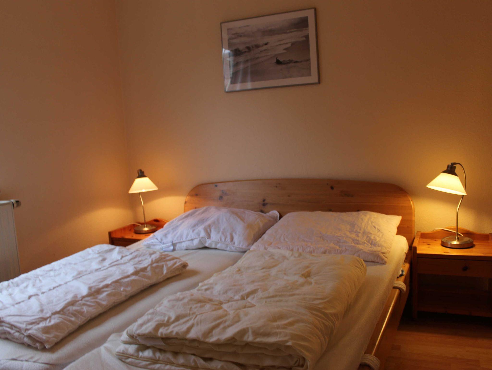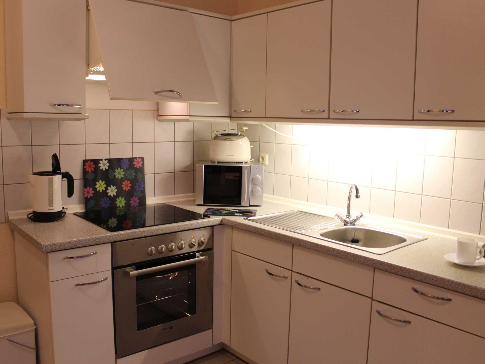 In dieser Ferienwohnung befindet sich ein Wohnbereich mit offener Küche. Vom Flur aus gelangen Sie in das Schlafzimmer mit Doppelbett und in das Badezimmer mit Dusche und WC.