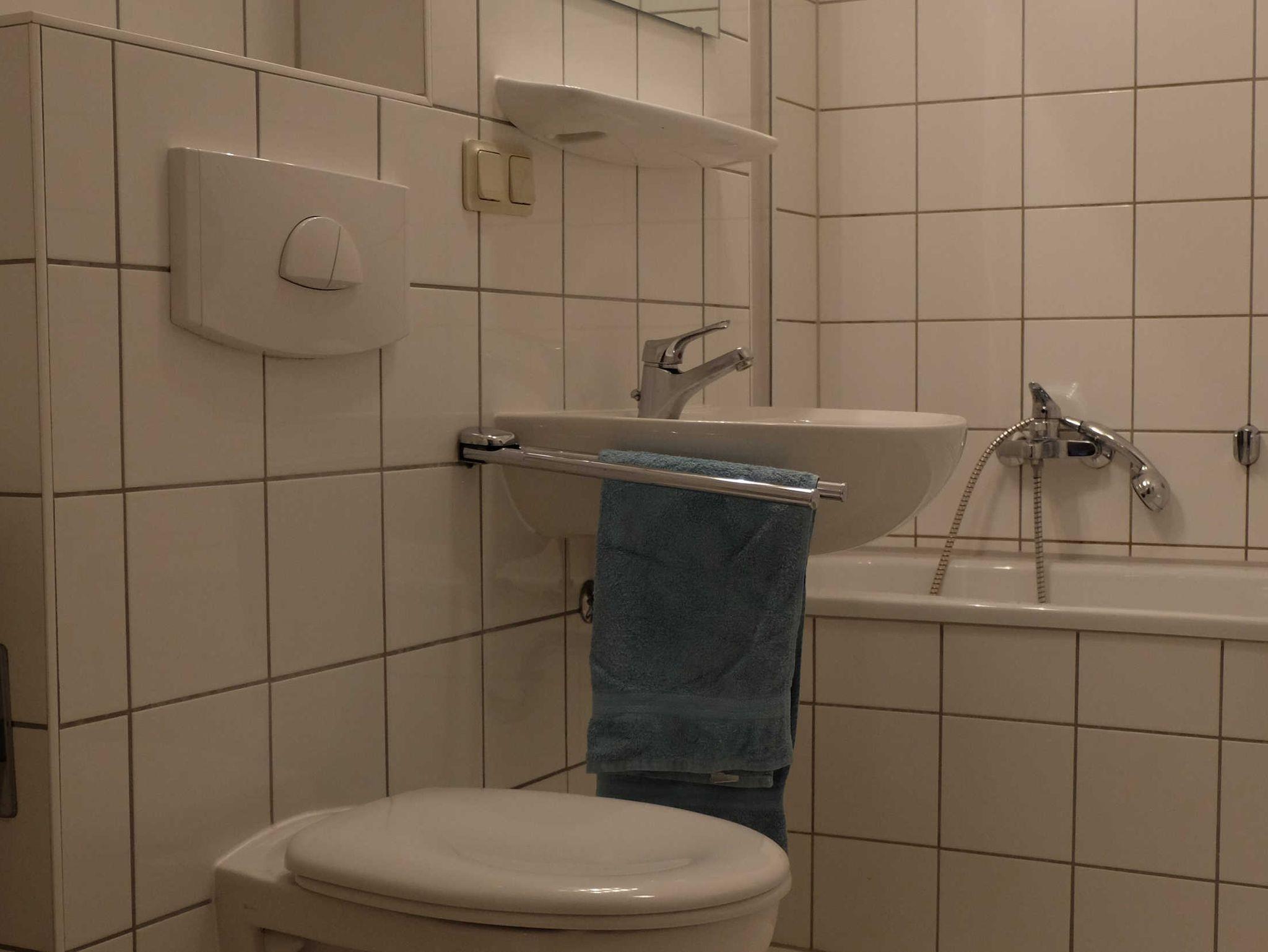 Im Bad befindet sich eine Badewanne mit Duschvorhang, ein Waschtisch und ein WC.