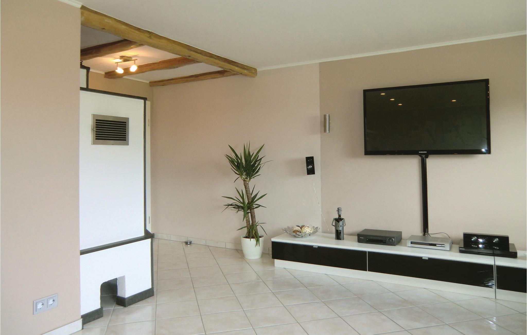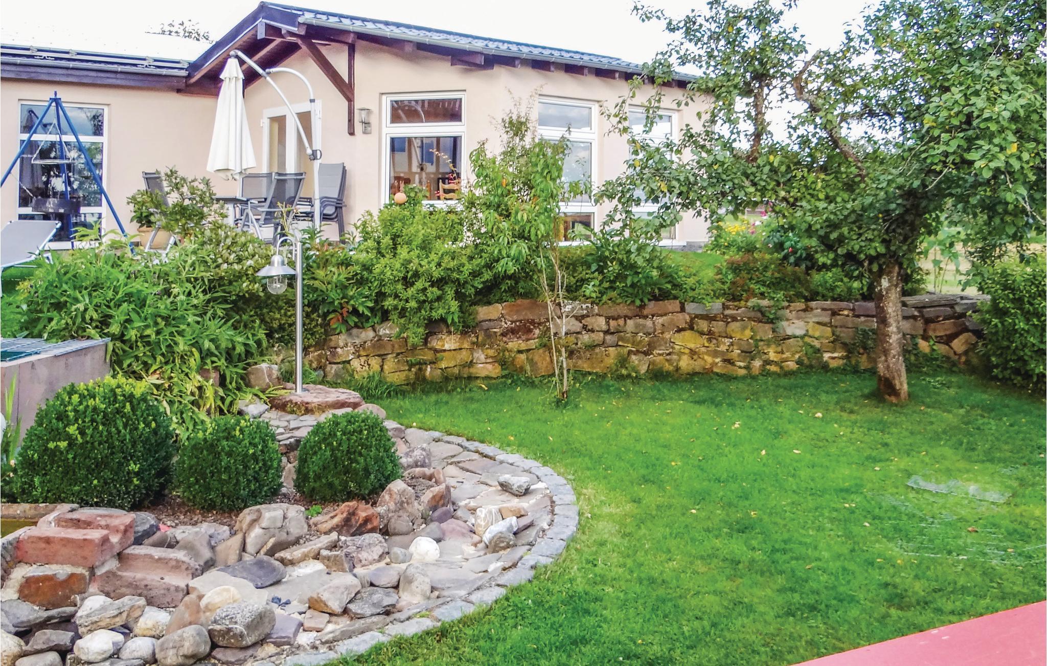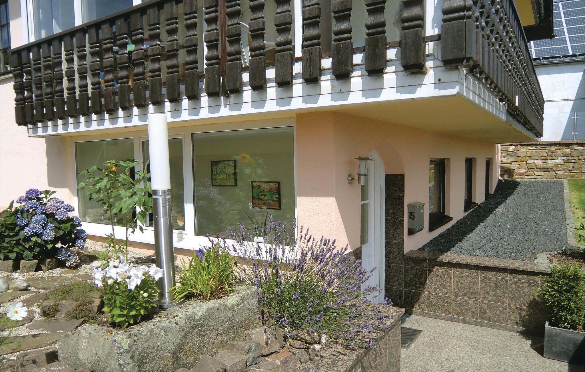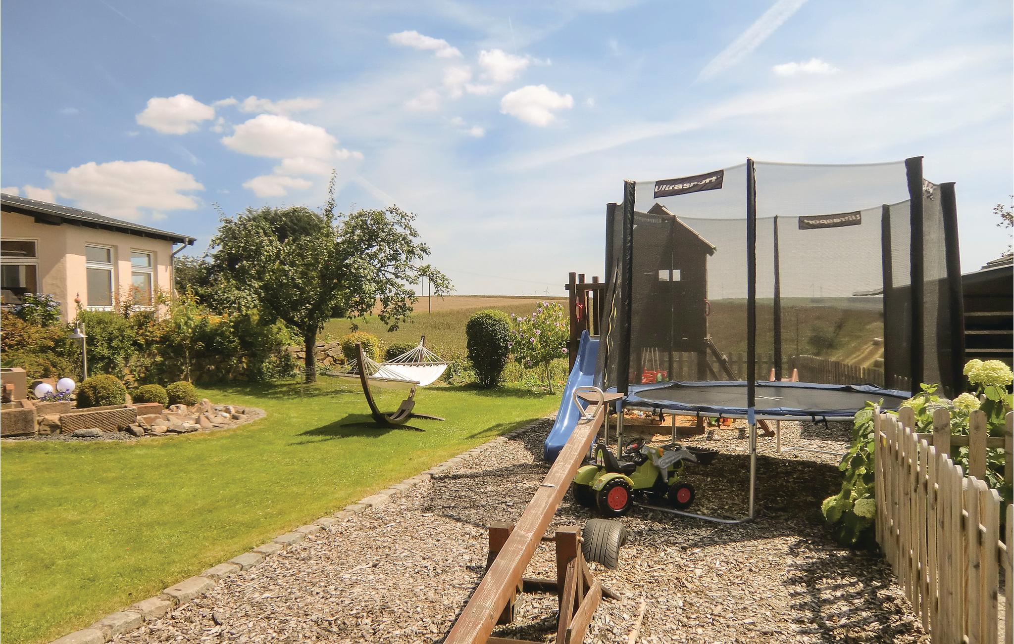 Diese Ferienwohnung in Karlshausen lässt nichts zu wünschen übrig. Sie ist hell und modern eingerichtet, und es stehen Ihnen viele Extras zur Verfügung, zum Beispiel ein Gartenhaus mit Grill und Holzofen, ein Trampolin und ein Kachelofen, der eine angenehme, extra Heizquelle bietet. Das Holz für den Ofen wird Ihnen kostenlos zur Verfügung gestellt. Eines der Schlafzimmer hat einen begehbaren Kleiderschrank. Der gepflegte Garten lockt mit vielen Sitz- und Liegemöglichkeiten und einer schönen Aussicht. Auf Anfrage stellt der Vermieter bei gutem Wetter gern ein Kinderbecken mit Rutsche auf. In der Garage bzw. Halle gibt es eine Tischtennisplatte, eine Schaukel und eine Dartscheibe. Auf dem Grundstück befindet sich eine Wasseranlage, die aber der Vermieter auf vorheriger Anfrage für Kinder absichern kann. Angrenzend hat der Vermieter einen Bauernhof mit mehreren Pferden. Dort können Sie Reitunterricht bekommen, und Sie haben auf Anfrage und gegen Gebühr die Möglichkeit, Ihr eigenes Pferd mitzubringen. Die Unterbringung eines eigenen Pferdes kostet ab EUR 15/Tag, und der Reitunterricht beginnt bei EUR 15/Stunde in der Gruppe und bei EUR 30/Einzelstunde. Auf der Wiese gegenüber vom Haus grasen meistens zwei Ponys. Ihre frischen Brötchen erhalten Sie gegenüber im kleinen Supermarkt. Karlshausen ist eine Gemeinde in der Eifel in Rheinland-Pfalz und gehört der Verbandsgemeinde Südeifel an. Im Naturschutzgebiet Irsental können Sie sehr schön wandern, und bei Arzfeld (8 km) verläuft ein fast überall gepflasterter Fahrradweg entlang einer ehemaligen Eisenbahnlinie mit Verbindung nach St. Vith, Prüm, Neuerburg, Irrel usw. Arzfeld lockt auch mit einem kleinen See. Schwimmbäder finden Sie in Neuerburg und Prüm.