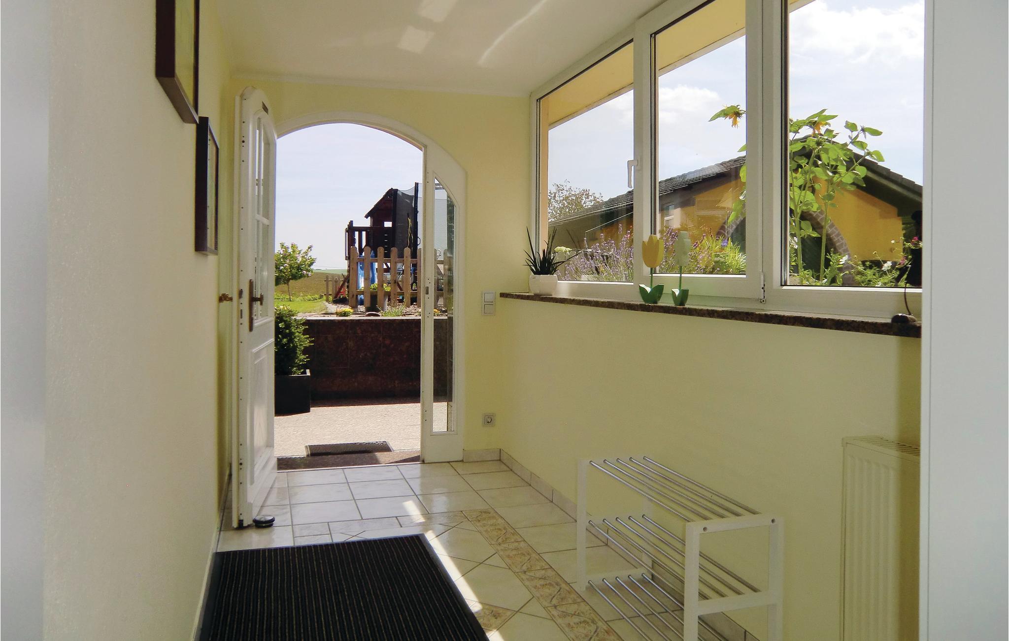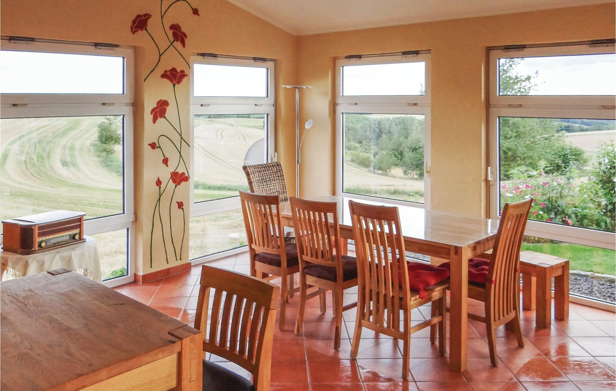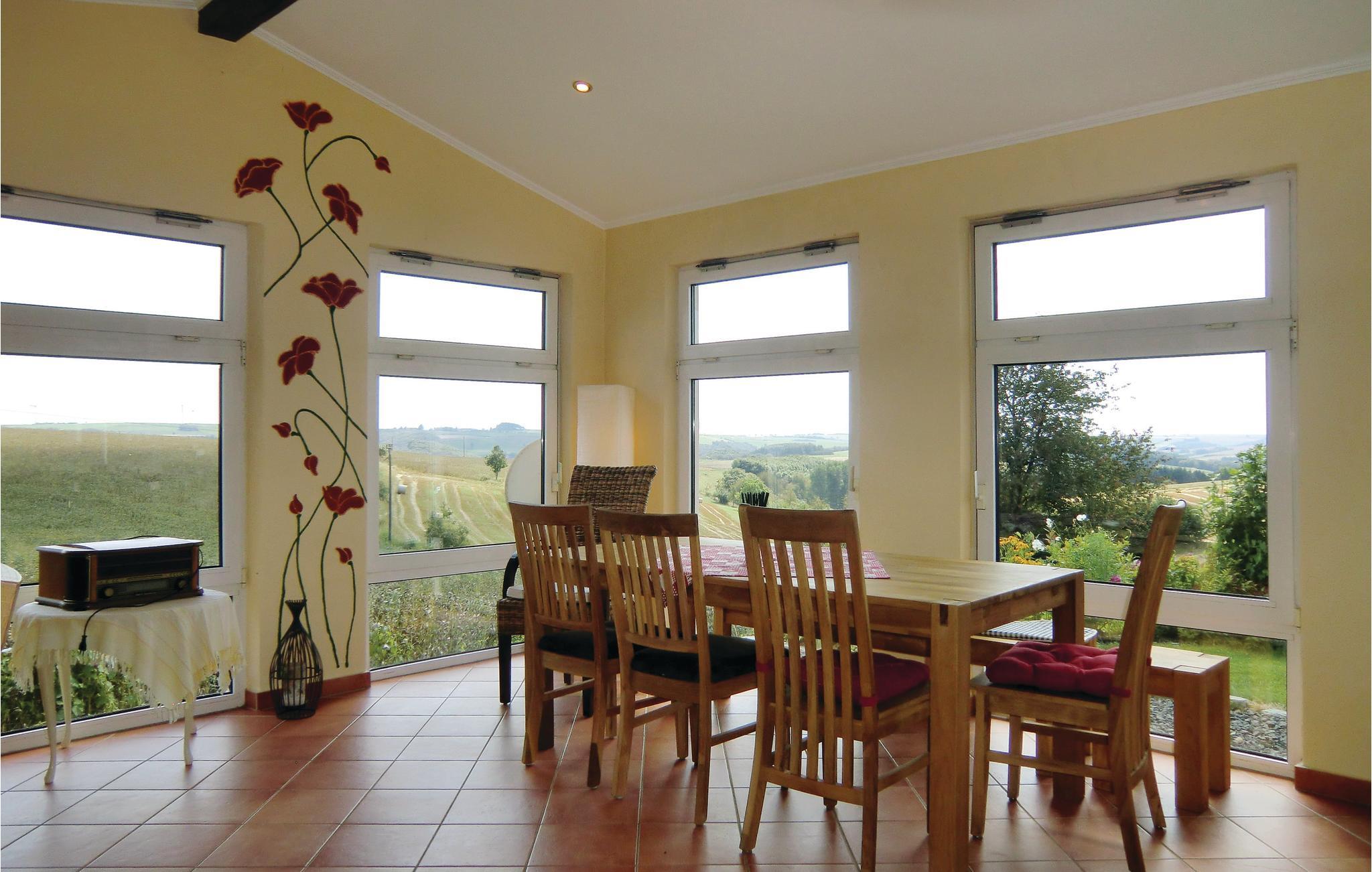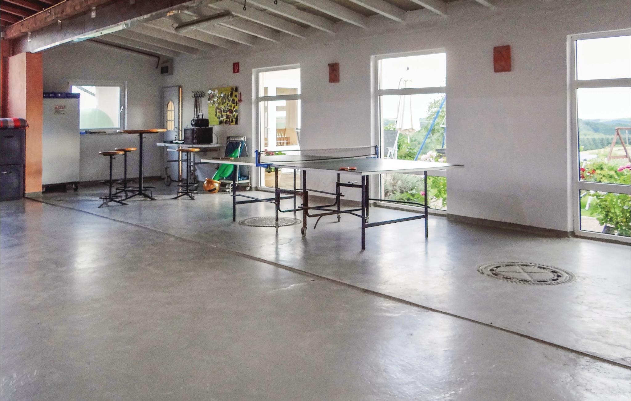 Diese Ferienwohnung in Karlshausen lässt nichts zu wünschen übrig. Sie ist hell und modern eingerichtet, und es stehen Ihnen viele Extras zur Verfügung, zum Beispiel ein Gartenhaus mit Grill und Holzofen, ein Trampolin und ein Kachelofen, der eine angenehme, extra Heizquelle bietet. Das Holz für den Ofen wird Ihnen kostenlos zur Verfügung gestellt. Eines der Schlafzimmer hat einen begehbaren Kleiderschrank. Der gepflegte Garten lockt mit vielen Sitz- und Liegemöglichkeiten und einer schönen Aussicht. Auf Anfrage stellt der Vermieter bei gutem Wetter gern ein Kinderbecken mit Rutsche auf. In der Garage bzw. Halle gibt es eine Tischtennisplatte, eine Schaukel und eine Dartscheibe. Auf dem Grundstück befindet sich eine Wasseranlage, die aber der Vermieter auf vorheriger Anfrage für Kinder absichern kann. Angrenzend hat der Vermieter einen Bauernhof mit mehreren Pferden. Dort können Sie Reitunterricht bekommen, und Sie haben auf Anfrage und gegen Gebühr die Möglichkeit, Ihr eigenes Pferd mitzubringen. Die Unterbringung eines eigenen Pferdes kostet ab EUR 15/Tag, und der Reitunterricht beginnt bei EUR 15/Stunde in der Gruppe und bei EUR 30/Einzelstunde. Auf der Wiese gegenüber vom Haus grasen meistens zwei Ponys. Ihre frischen Brötchen erhalten Sie gegenüber im kleinen Supermarkt. Karlshausen ist eine Gemeinde in der Eifel in Rheinland-Pfalz und gehört der Verbandsgemeinde Südeifel an. Im Naturschutzgebiet Irsental können Sie sehr schön wandern, und bei Arzfeld (8 km) verläuft ein fast überall gepflasterter Fahrradweg entlang einer ehemaligen Eisenbahnlinie mit Verbindung nach St. Vith, Prüm, Neuerburg, Irrel usw. Arzfeld lockt auch mit einem kleinen See. Schwimmbäder finden Sie in Neuerburg und Prüm.