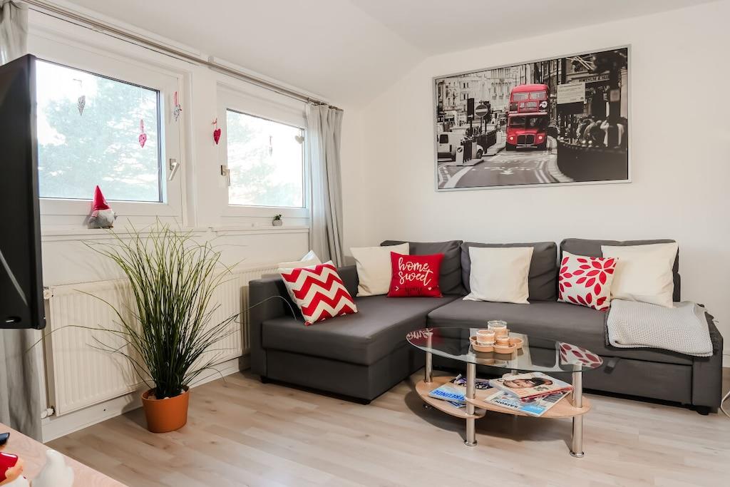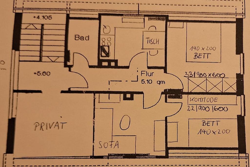 Auf 50 qm erwartet Sie im 2. Obergeschoss eine 3-Zimmerwohnung mit 2 Schlafzimmern, einem Wohnzimmer und voll ausgestatteter Küche mit Essplatz. Ein helles Bad mit Fenster, Badewanne mit Duschtrennwand soll das Urlaubserlebnis abrunden.