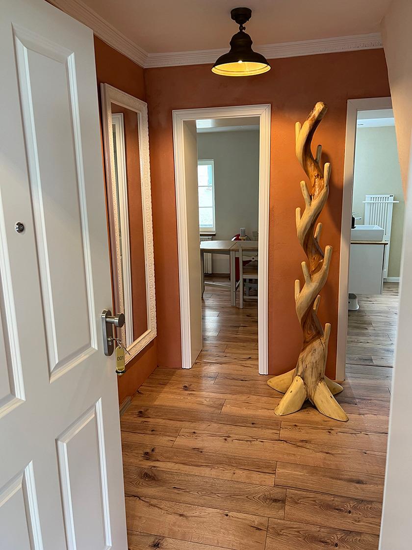 Das Apartment 001 befindet sich in einer ruhigen Naturrandlage Kassels in einem Fachwerkhaus aus dem 19. Jahrhundert, das schrittweise unter Zuhilfenahme biologischer Werkstoffe (Lehm, Stroh, Holz) restauriert wird. Geheizt wird ausschließlich mit 100 % Öko-Strom; damit entspricht dieses Apartment in besonderer Weise nachhaltigem Wohnen, was sich zudem positiv im Raumklima niederschlägt.