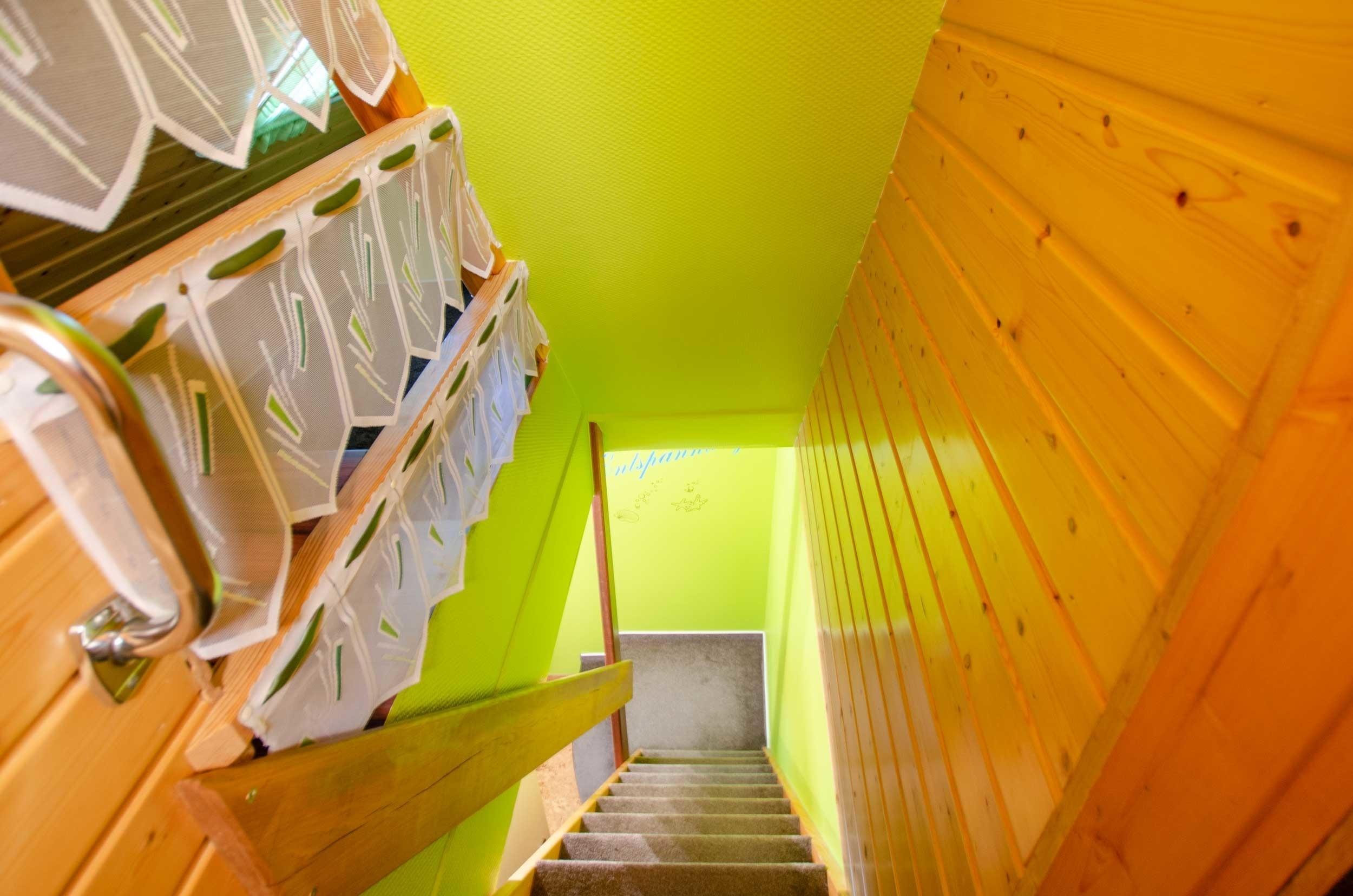 Über eine offene Holztreppe gelangt man in die nächste Etage mit den Schlafräumen.