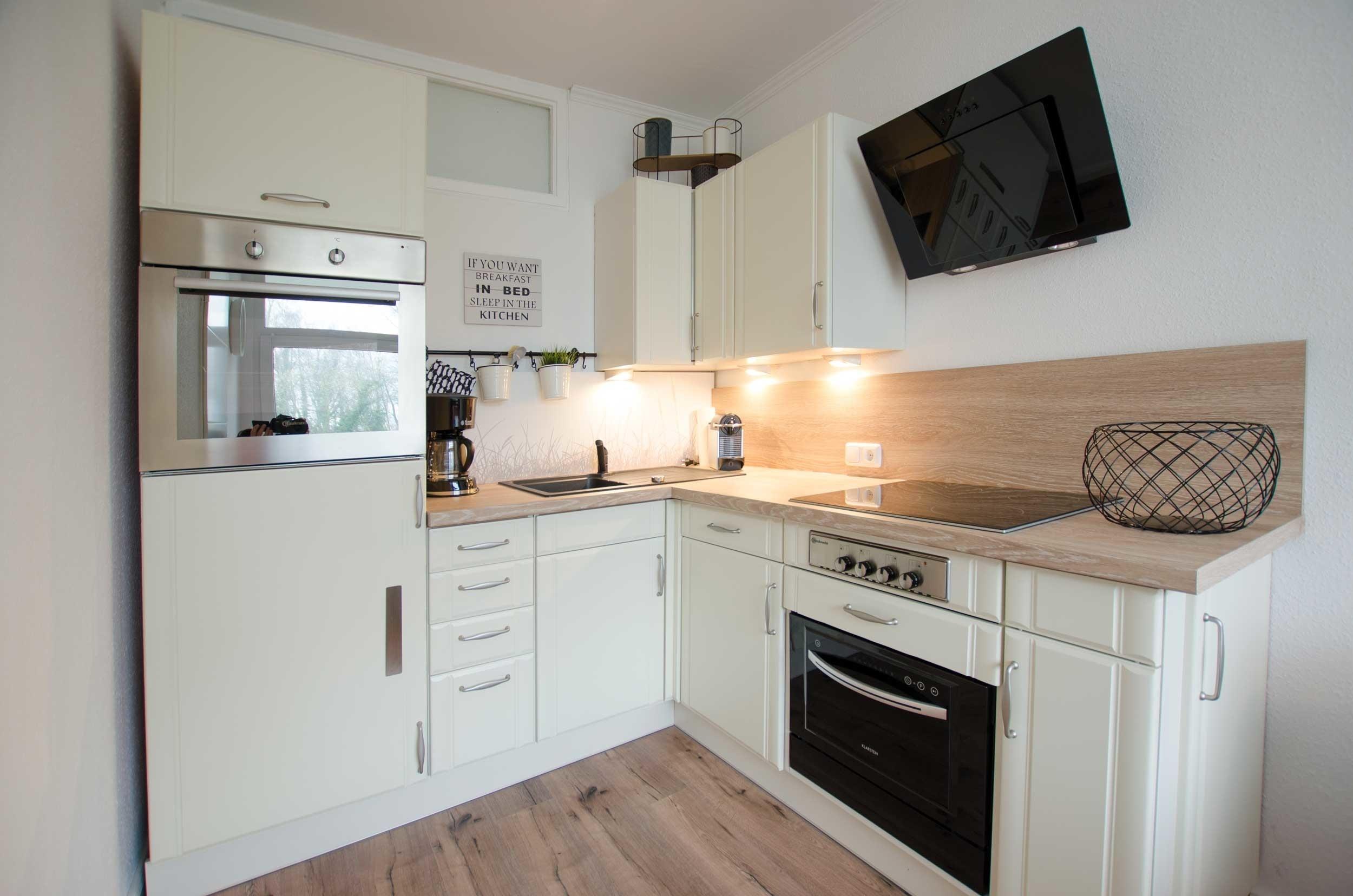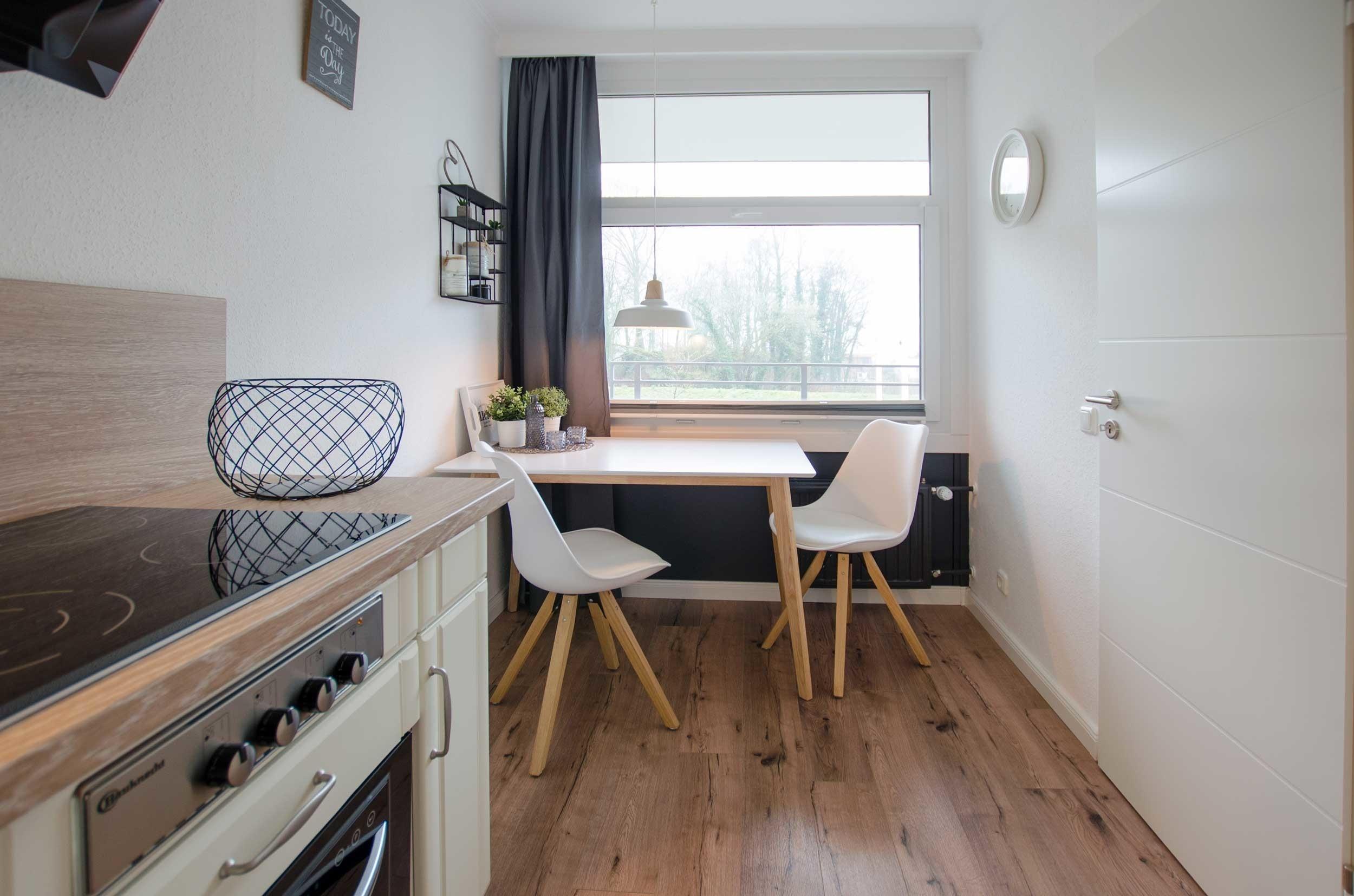 Die helle Küche ist gut ausgestattet und bietet mit einem Tisch am Panoramafenster einen Essplatz mit toller Aussicht.
