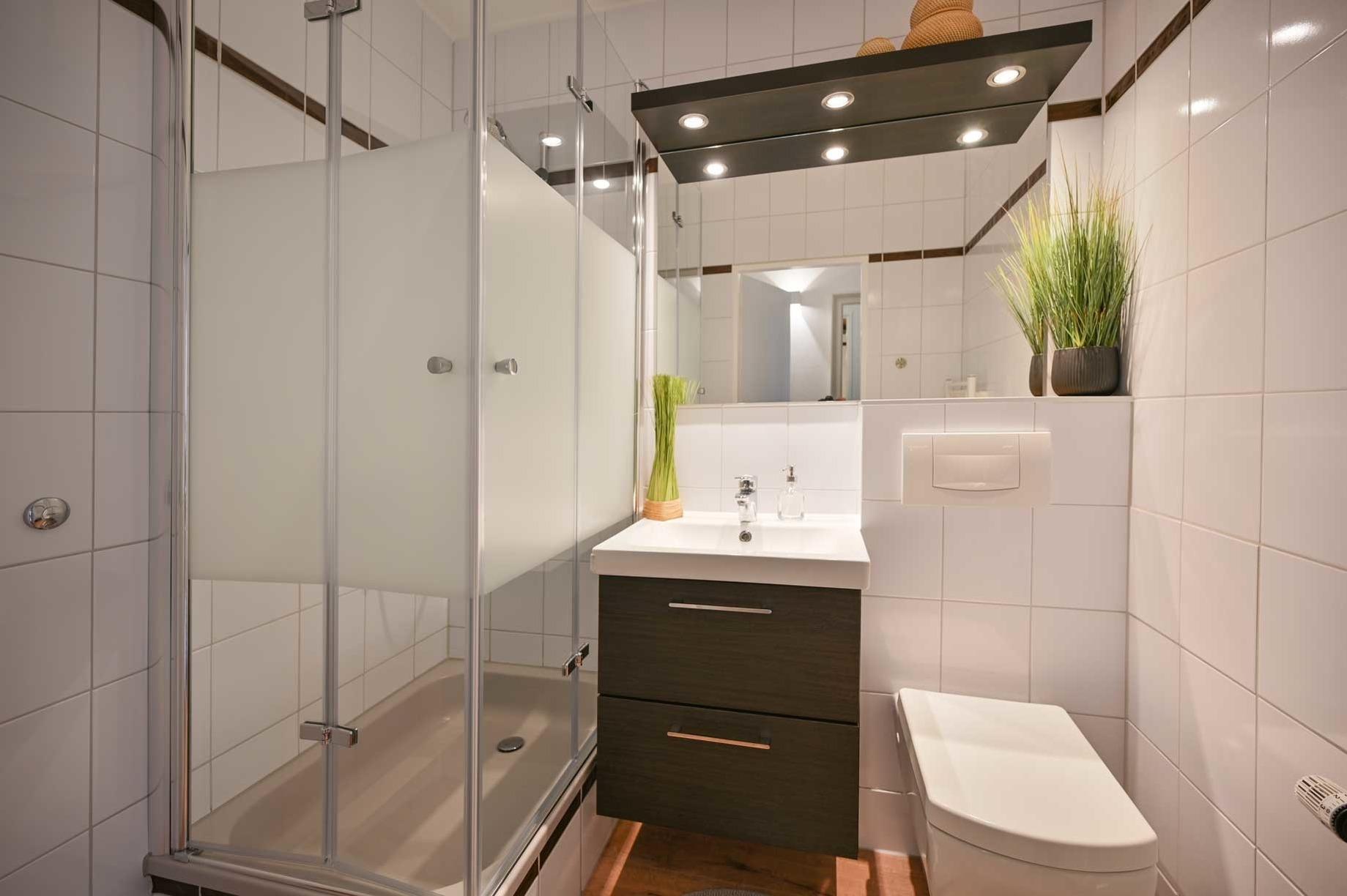 Das Duschbad wurde modernisiert und ist mit WC, Waschkommode, Handtuchheizkörper, Haarföhn und einem großen Spiegel ausgestattet.