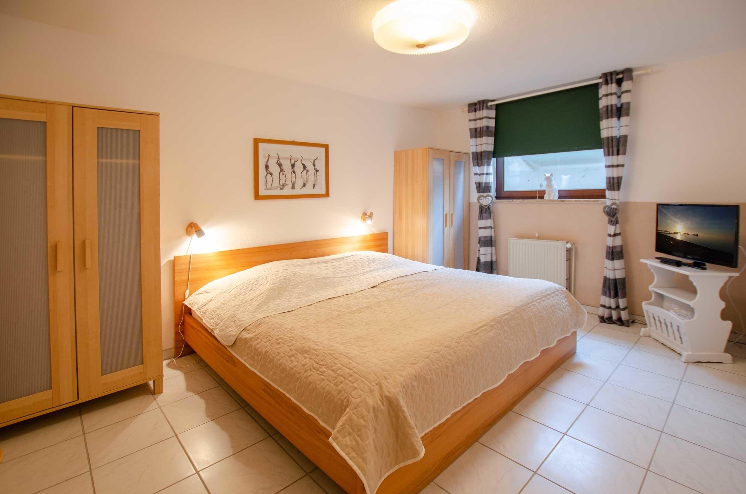 Das separate Schlafzimmer mit Doppelbett verfügt außerdem über zwei Kleiderschränke.