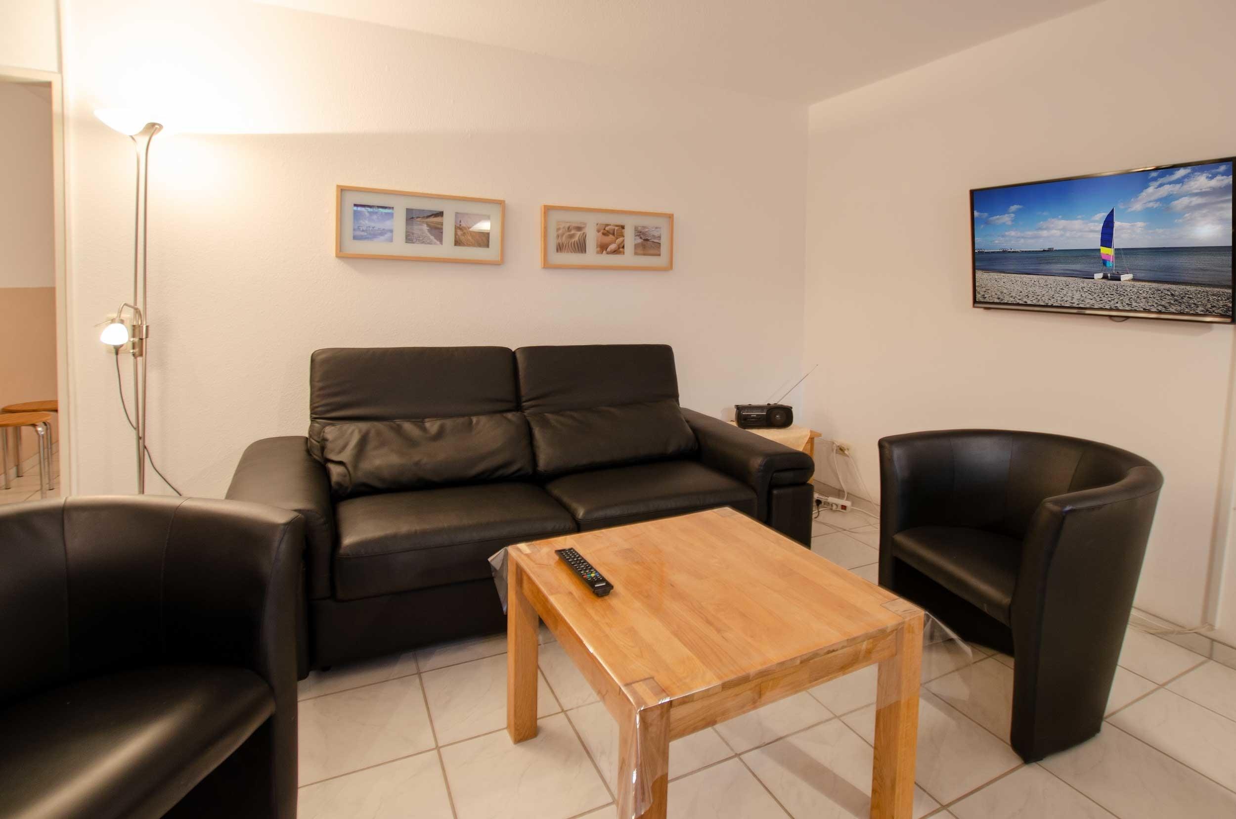 Das schöne Wohnzimmer der Fewo verfügt über ein Schlafsofa, das für zwei Personen geeignet ist, einen Couchtisch und einen Esstisch der für 3 Personen ausgelegt ist.