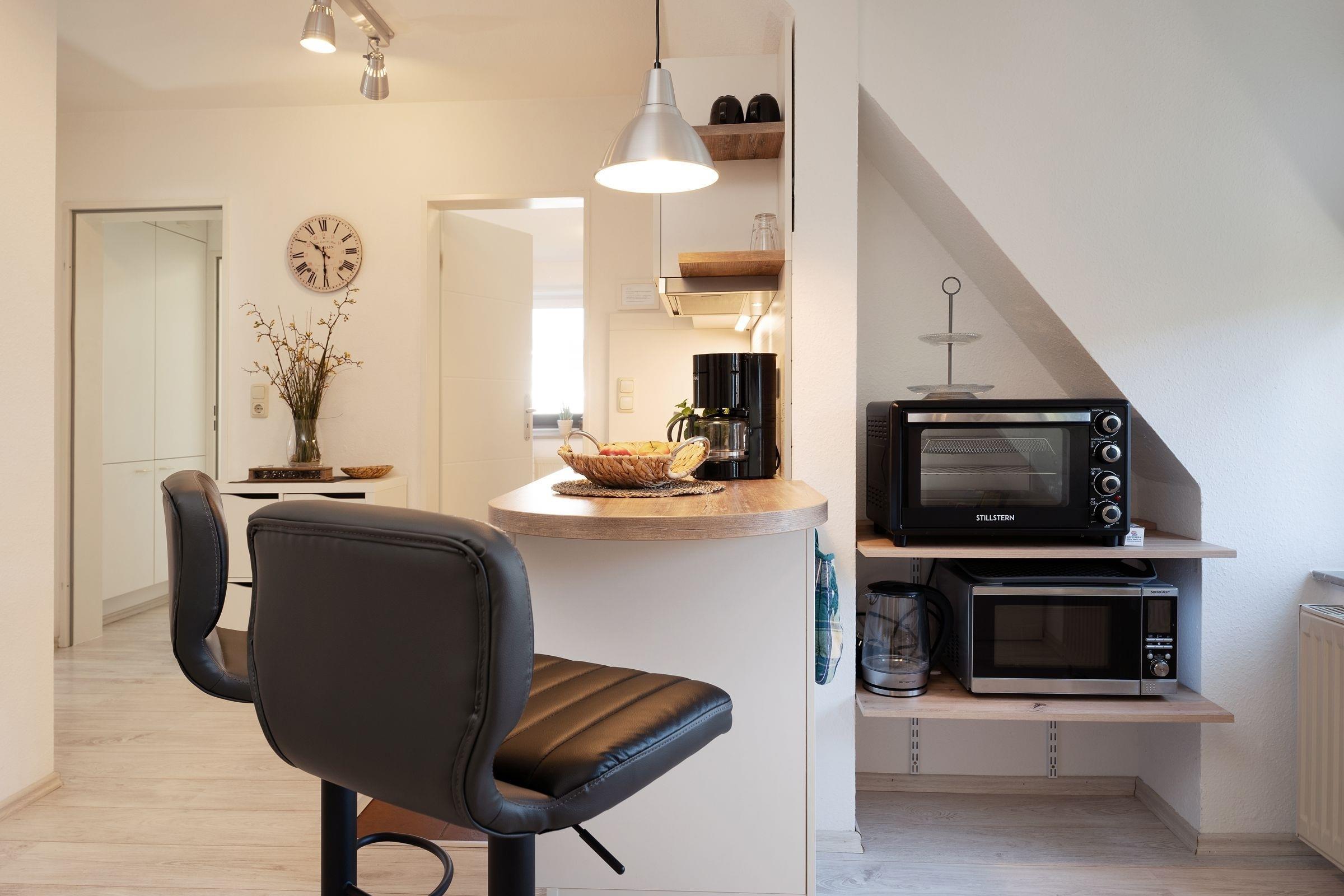 Sie möchten einfach mal abschalten und die Seele baumeln lassen? Dann sind Sie in dieser zauberhaften Ferienwohnung Moby Dick im Haus Gorch Fock genau richtig. Die durchdachte Raumaufteilung sowie die liebevoll ausgesuchte Einrichtung machen das Objekt zu einem echten Schmuckstück. Der Wohn-/Ess-Bereich begrüßt Sie mit einer kuscheligen Sofa-Landschaft, die Dachschrägen sorgen dabei für ein gemütliches Ambiente. Hier können Sie kuschelige Abende vor dem TV-Gerät verbringen. Für die Nacht lässt sich das Sofa mit wenigen Handgriffen in ein Doppelbett (ca. 150x200 cm) verwandeln. Im selben Raum befindet sich auch eine helle, schicke Ess-Ecke. Hier können Sie Ihre Mahlzeiten genießen oder auch lustige Spiele-Abende veranstalten. Und Sie können von hier aus auch den möblierten Balkon betreten und in der Sonne sitzen. Die gut ausgestattete Küche mit Geschirrspüler befindet sich separat im Flurbereich und hat einen raffinierten Tresen, an dem Sie auch gut verweilen können. Im geräumigen Schafzimmer steht ein Doppelbett bereit, in dem Sie sicher traumhaft schlafen werden. Das moderne Duschbad mit Fenster lässt keine Wünsche offen. Eine lauschige Kaminecke im Gemeinschaftsraum des Hauses rundet das Angebot ab.