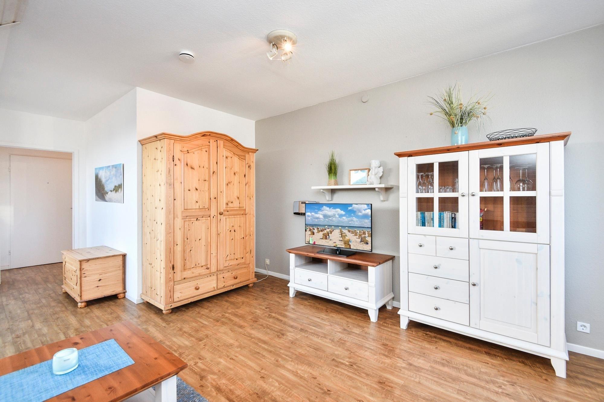 Gemütlichkeit wird in diesem kleinen, feinen Objekt im Appartementhaus Hamburger Straße 11 großgeschrieben. Treten Sie ein, das durchdachte Raumkonzept kombiniert mit einer liebevoll ausgesuchten Einrichtung wird Sie sofort überzeugen. Nehmen Sie Platz auf der kuscheligen Sofa-Landschaft – durch die Dachschräge ist es hier besonders gemütlich. Hier können Sie tagsüber wunderbar entspannen. Und für die Nacht wird aus der Schlafcouch ein komfortables Doppelbett (160x200 cm). Hier werden Sie sicher süß träumen. Doch bevor es soweit ist, genießen Sie Ihren Tag an der Küste oder auch auf dem sonnigen, möblierten Balkon. Ein Sonnenschirm schützt Sie vor zu viel Sonne. Hier können Sie wunderbar auf Ihren schönen Urlaub anstoßen. Zurück im Wohnbereich befindet sich gleich neben der Balkontür eine raffinierte Ess-Ecke, die den Küchen-Bereich etwas abtrennt. Die helle Küche mit Geschirrspüler ist gut ausgestattet und bringt alle Voraussetzungen mit, Ihre Lieblings-Menüs zu zaubern. Ein großzügiges, modernes Duschbad verspricht einen guten Start in den Tag.