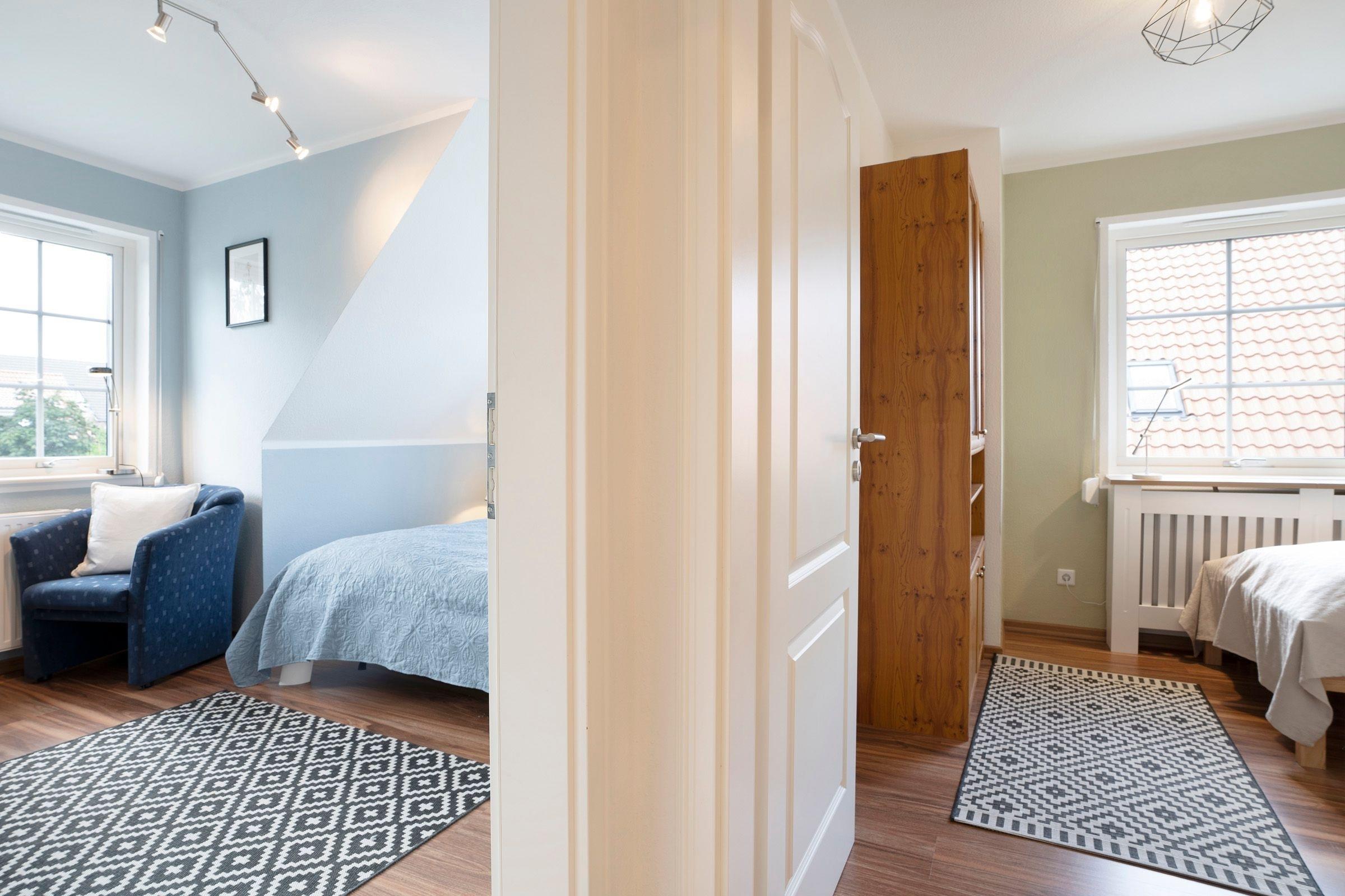 Die nötige Erholung bekommen Sie in der oberen Etage, wo sich die beiden Schlafzimmer und das Vollbad befinden. Die Schlafräume bieten einmal mit einem Doppelbett (2x 90x200 cm) und einer Schlafcouch (2x 85x200 cm), sowie zwei Einzelbetten (je 100x200 cm) im zweiten Schlafzimmer genug Rückzugsmöglichkeiten für Sie und Ihre Familie. Das Meersalz nach einem langen Strandtag waschen Sie sich in der bodengleichen Dusche im nebenliegenden Tageslichtbad ab.