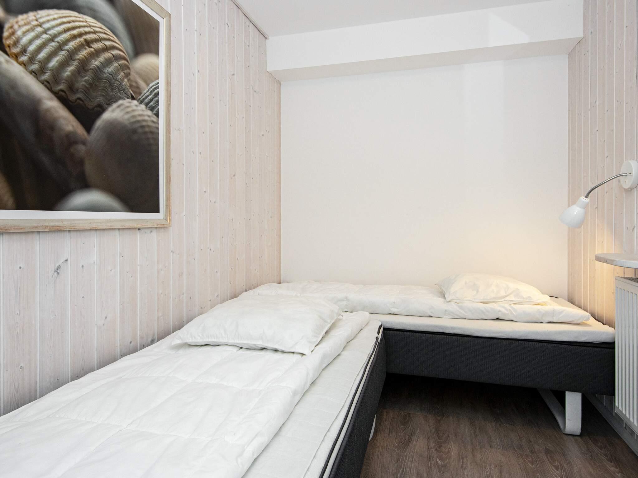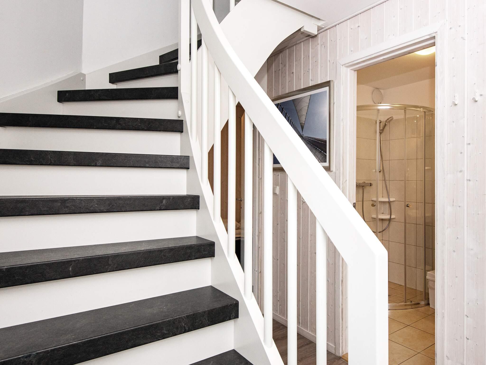 Die Häuser wurden im skandinavischen Stil auf zwei Etagen errichtet und die moderne Einrichtung, holzverkleidete Wände und Dachschrägen vermitteln eine helle und ansprechende Atmosphäre. Im Erdgeschoss befinden sich zwei Schlafzimmer und ein Bad mit Dusche, angenehmer Fußbodenheizung und Sauna. Vom Flur und den beiden Schlafzimmern geht es hinaus auf die Terrasse.