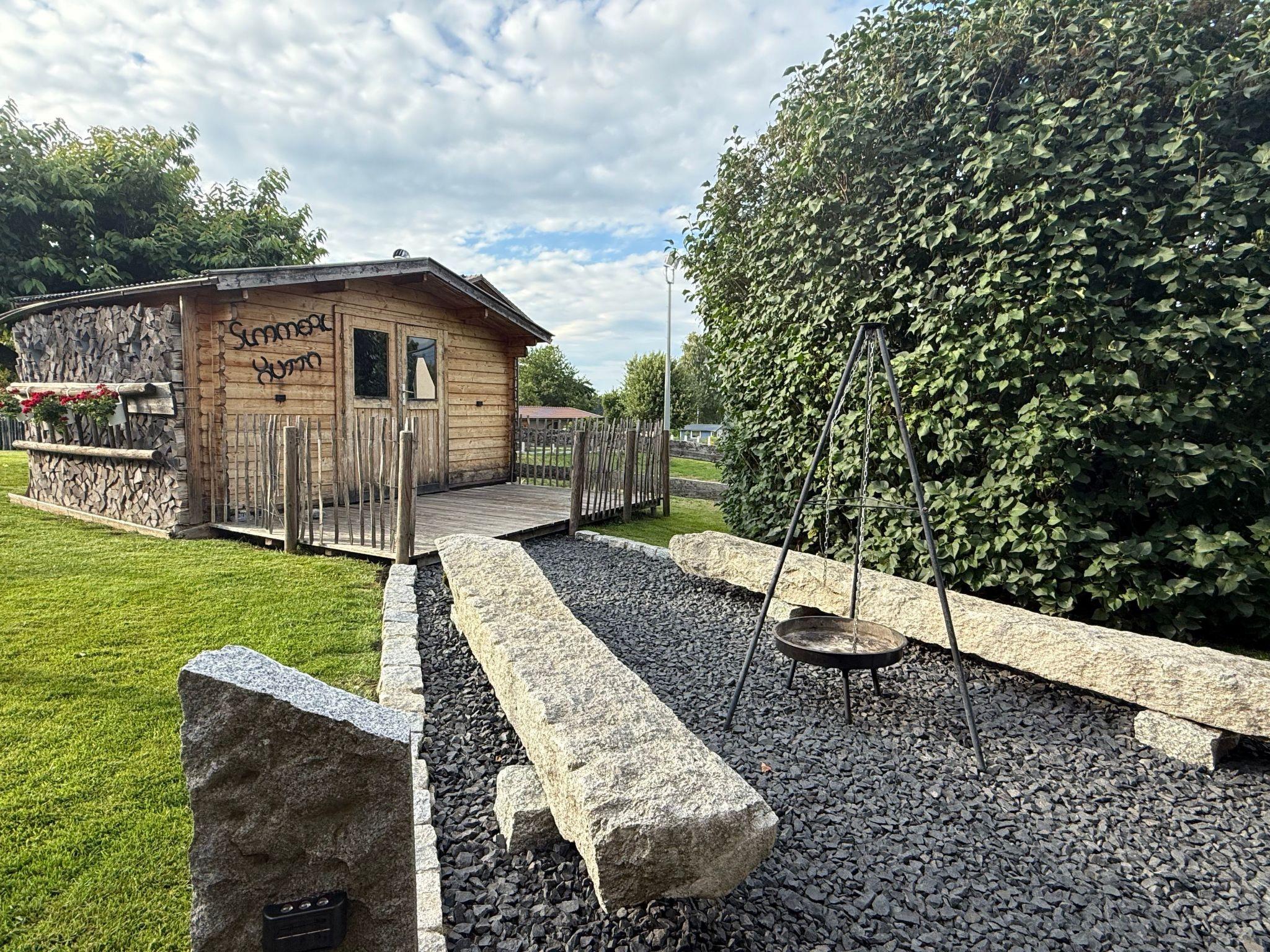 Im Außenbereich des Ferienhauses gibt es einen Kinderspielplatz mit Schaukel. Des weiteren ist ein Grillplatz und an der Südseite des Hauses ist noch eine Holzterrasse mit Gartenmöbel vorhanden.