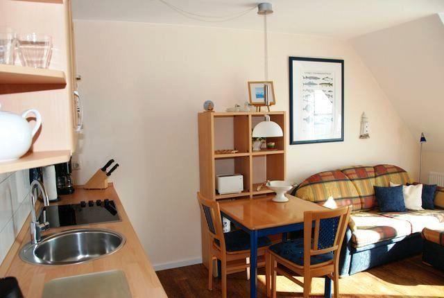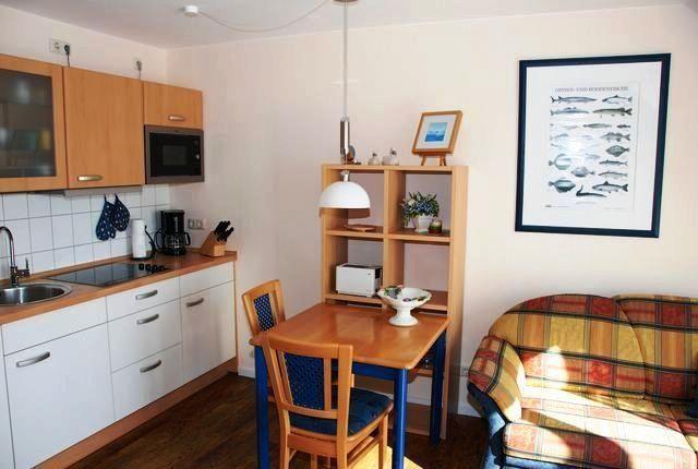 Die angrenzende integrierte Küchenzeile ist mit einem Herd, Geschirrspüler, Kaffeemaschine, Wasserkocher und Mikrowelle mit Backfunktion ausgestattet. Ausreichend Geschirr und Küchenutensilien sind ebenfalls vorhanden.