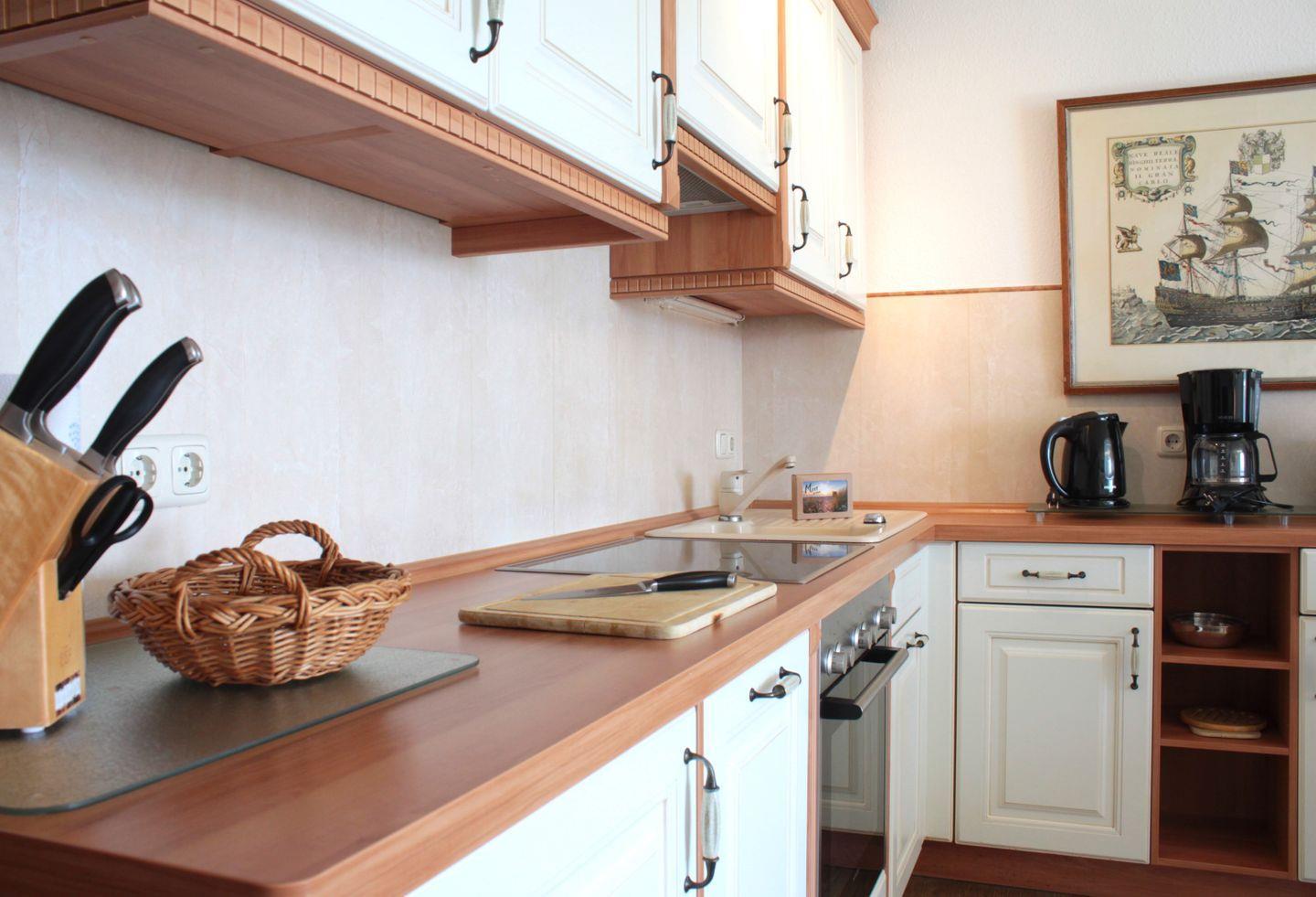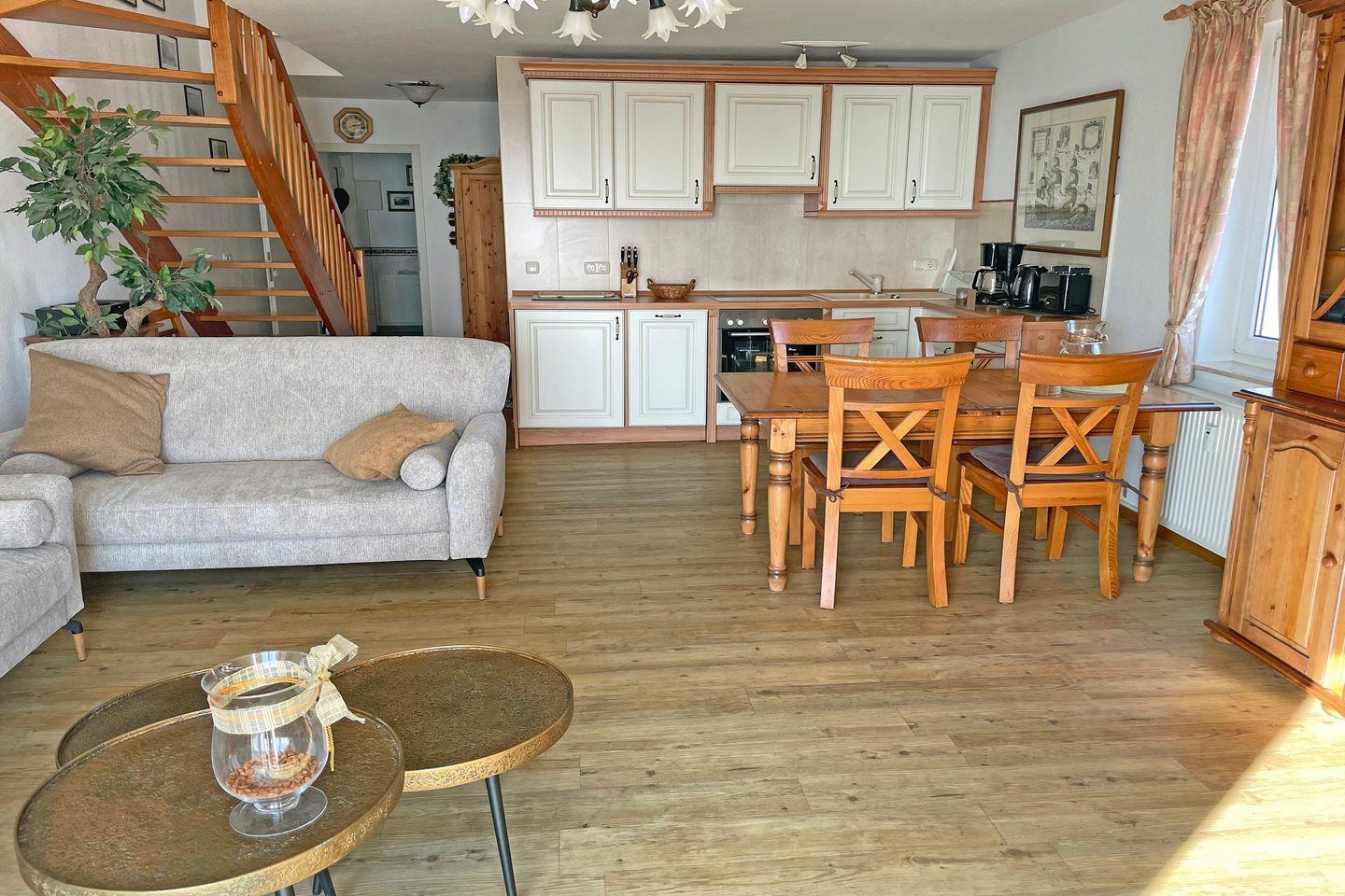 In dem mit einer Sofaecke und Flachbild-TV eingerichteten Wohn- und Essbereich ist außerdem eine Küche integriert. Diese ist mit allen notwendigen technischen Geräten, wie z.B. Herd mit Backofen, Geschirrspülmaschine, Wasserkocher, Kaffeemaschine u.v.m. ausgestattet und bietet Ihnen gute Möglichkeiten für die Zubereitung Ihrer Mahlzeiten, die Sie am angrenzenden großzügigen Esstisch genießen können.