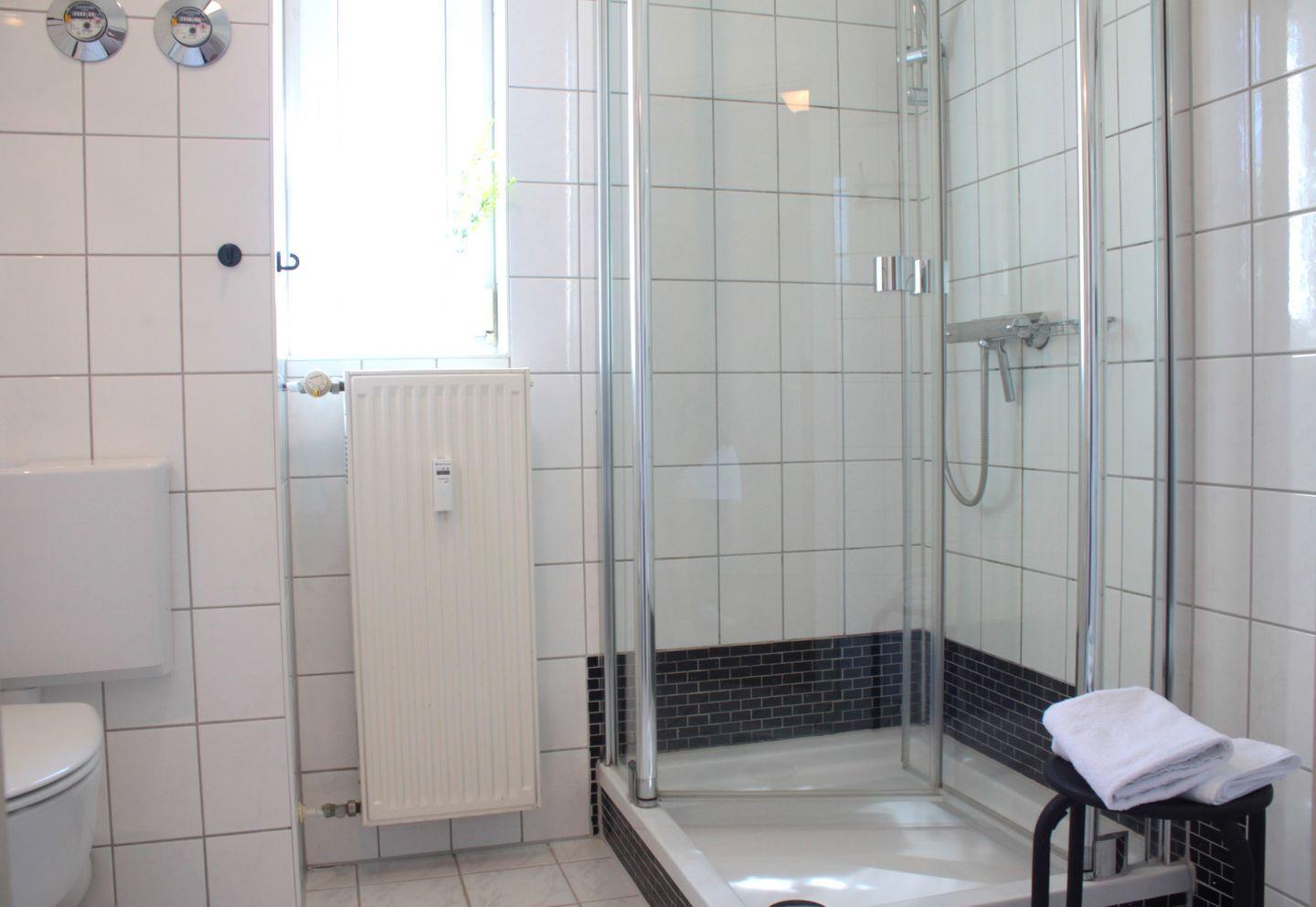 Das Tageslichtbadezimmer befindet sich in der unteren Etage der Wohnung und ist mit einer Dusche, einem WC, einem Waschtisch und einem Fön eingerichtet.