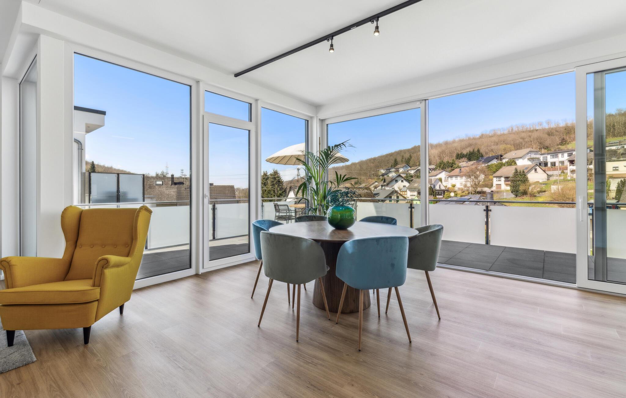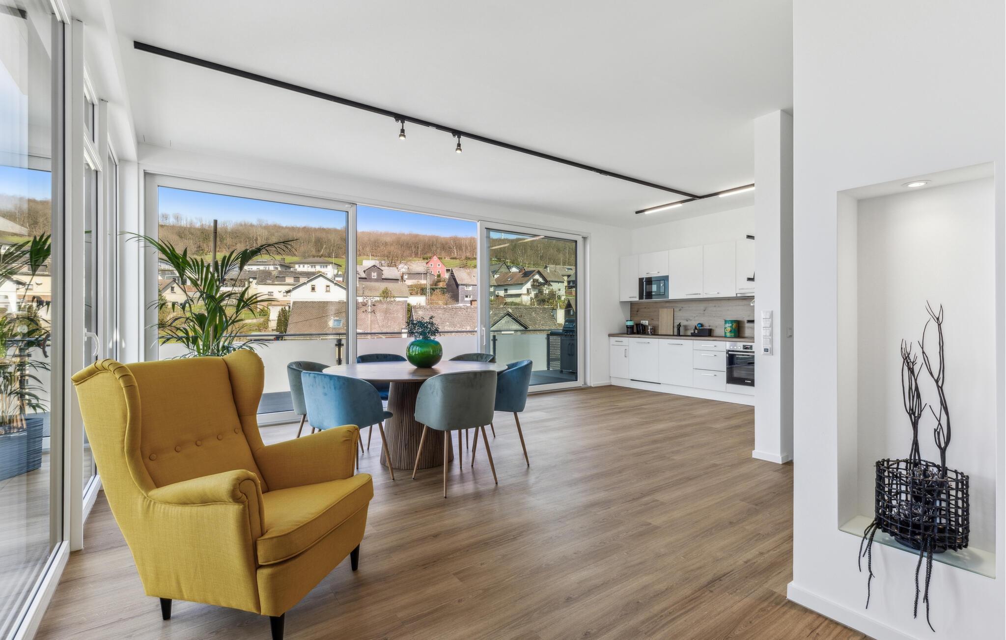 Verbringen Sie Ihre Urlaubstage in Ihrem hochwertig ausgestatteten Ferienhaus mit großzügigem Balkon und Panoramablick. Der offene Wohnbereich besticht durch seine bodentiefen Fenster. Der moderne Essplatz lädt zu ausgedehnten Mahlzeiten ein. Entspannen Sie sich im gemütlichen Sofabereich oder lesen Sie ein Buch im stilvollen Sessel. Nutzen Sie die moderne, offene Küche, die gemeinsames Kochen in angenehmer Atmosphäre ermöglicht.