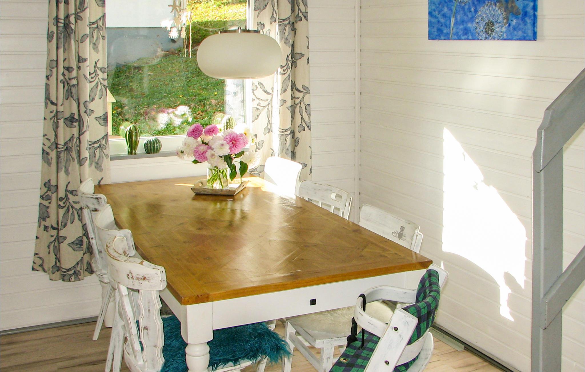 Sie betreten das Haus durch eine kleine Diele, die ausreichend Platz für Jacken, Schuhe und Hundezubehör bietet. Zudem finden Sie hier Spiele und Polster für im Freien. Weiter gelangen Sie in den gemütlichen Wohn-/Essbereich. Die Essecke bietet Platz für 6 Personen - ein vorhandener Babystuhl kann problemlos dazugestellt werden. Im liebevoll eingerichteten Wohnbereich sorgt ein großes, kuscheliges Ecksofa für die nötige Entspannung. Ein Kamin und eine Klimaanlage ermöglichen immer die richtige Temperatur. SAT-TV, W-LAN, Musik, sowie Bücher und Gesellschaftsspiele bieten Unterhaltung.