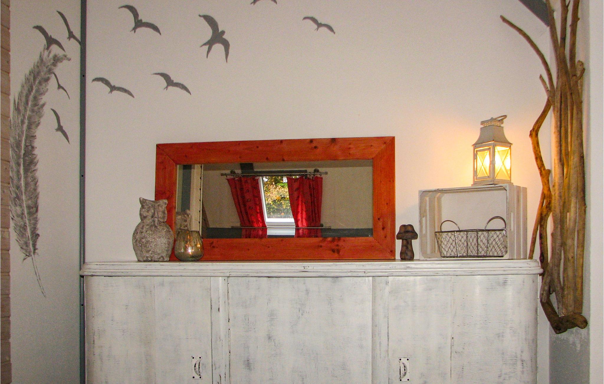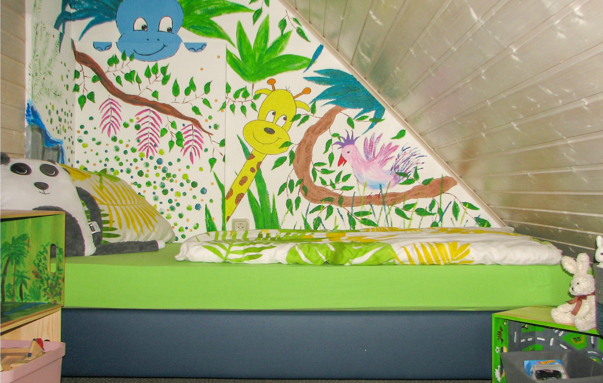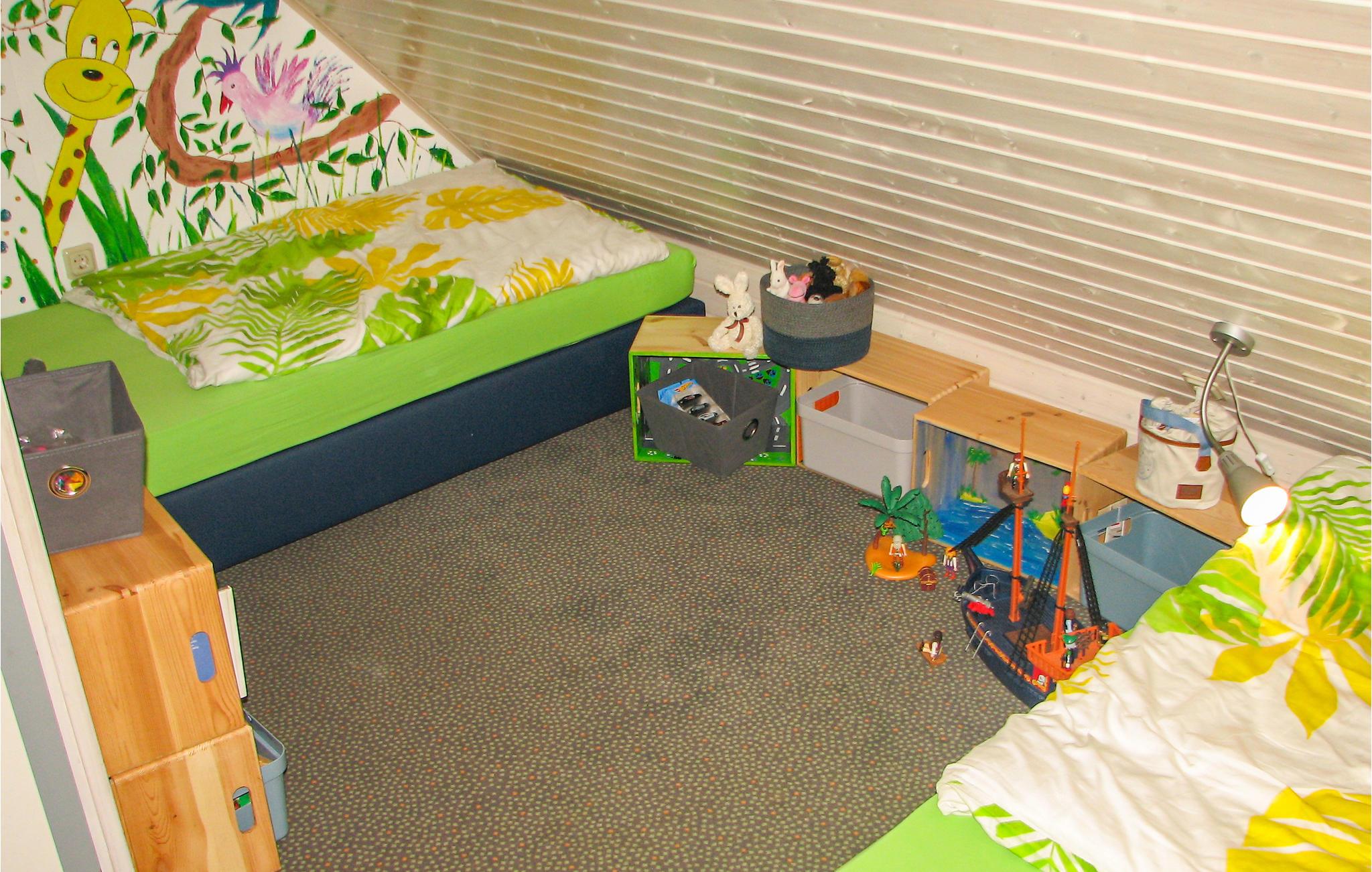 Zwei weitere Schlafräume mit Dachschrägen erreichen Sie über eine Wendeltreppe in der 2. Etage: Das Dschungelzimmer ist für die jüngeren Gäste – oder für junggebliebene, mutige Erwachsene. Hier gibt es zwei Einzelbetten und ganz viel zu entdecken: Z.B. Piraten, Puppenstube, Eisenbahn und Spielkisten.
