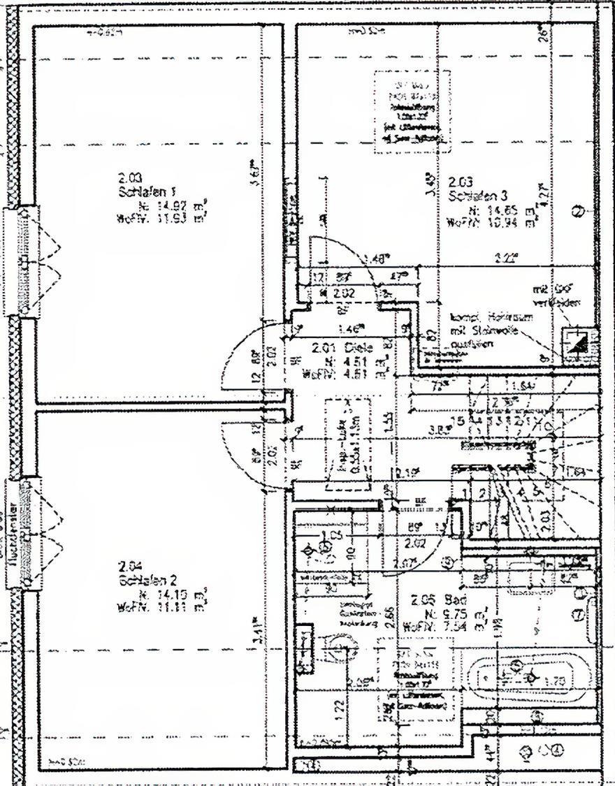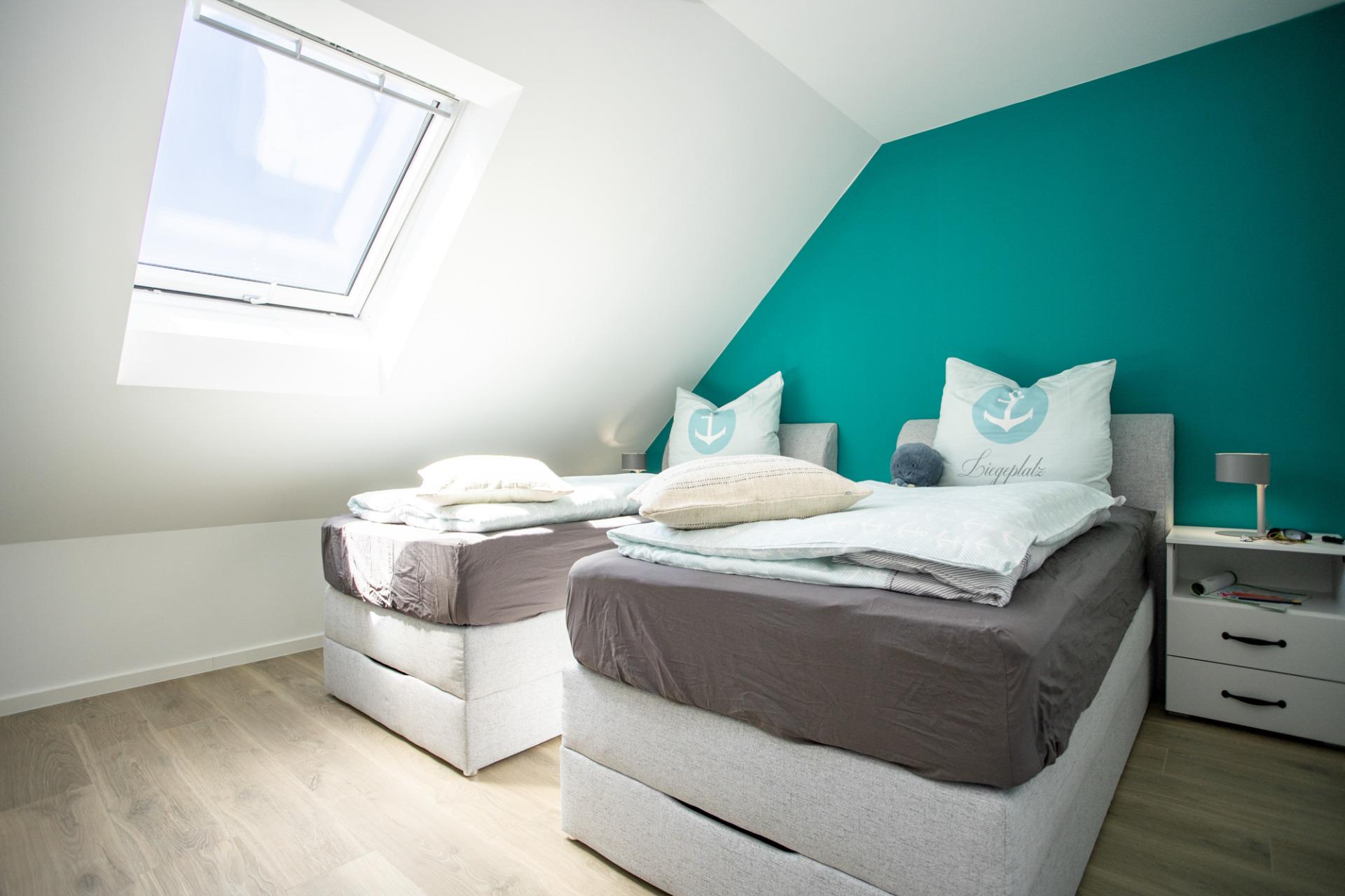 Die drei liebevoll gestalteten Schlafzimmer im Obergeschoss sind mit komfortablen Boxspringbetten ausgestattet – zwei Schlafzimmer jeweils mit einem 1,80 x 2,00 m Boxspringbett und großem Kleiderschrank. Das dritte Schlafzimmer mit zwei zusammen schiebbaren Einzelbetten je 1,00 x 2,00 m. Das Schlafzimmer verfügt über einen kleinen Kleiderschrank, Kommode, Nachttische und einen 40 Zoll Flatscreen-TV.