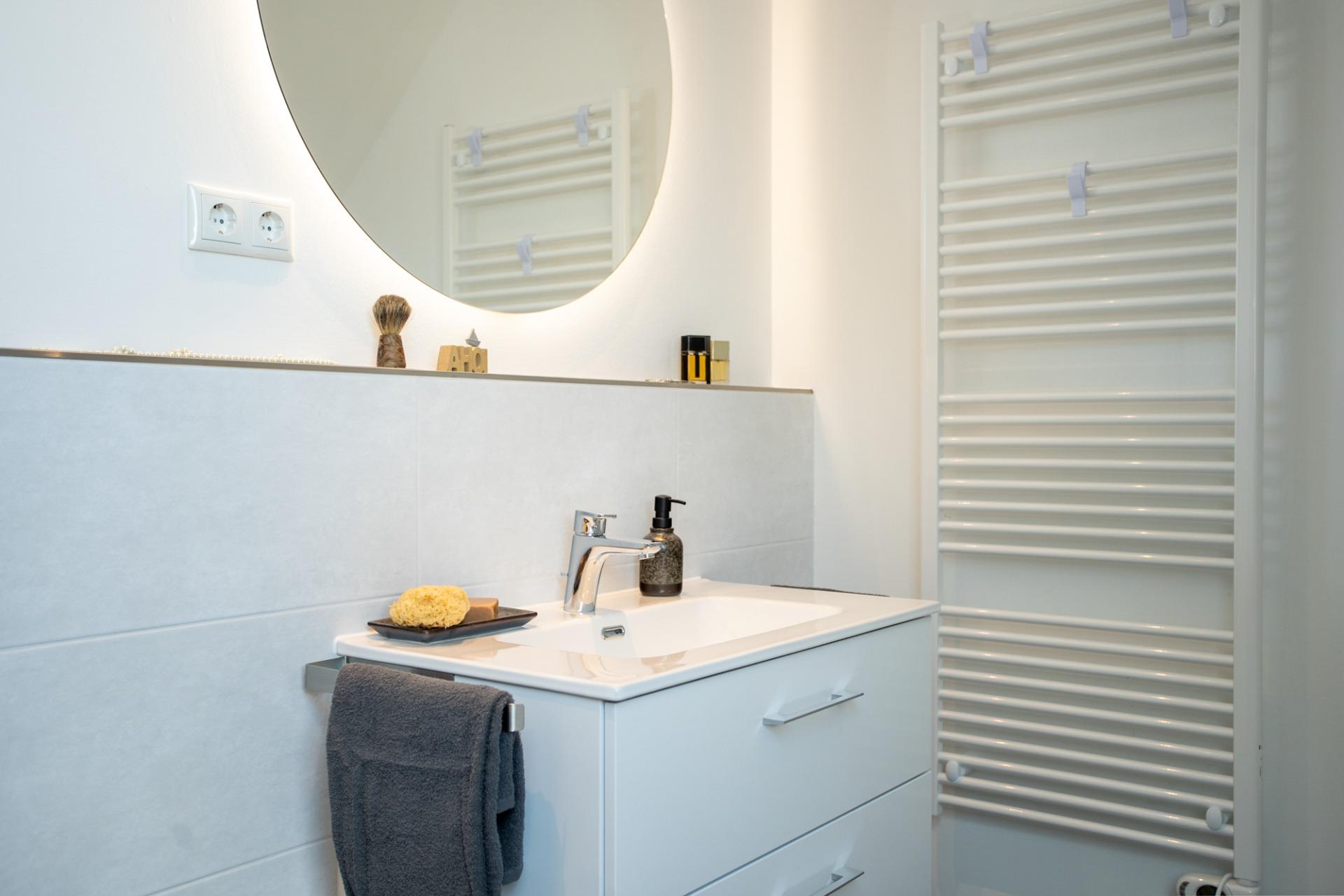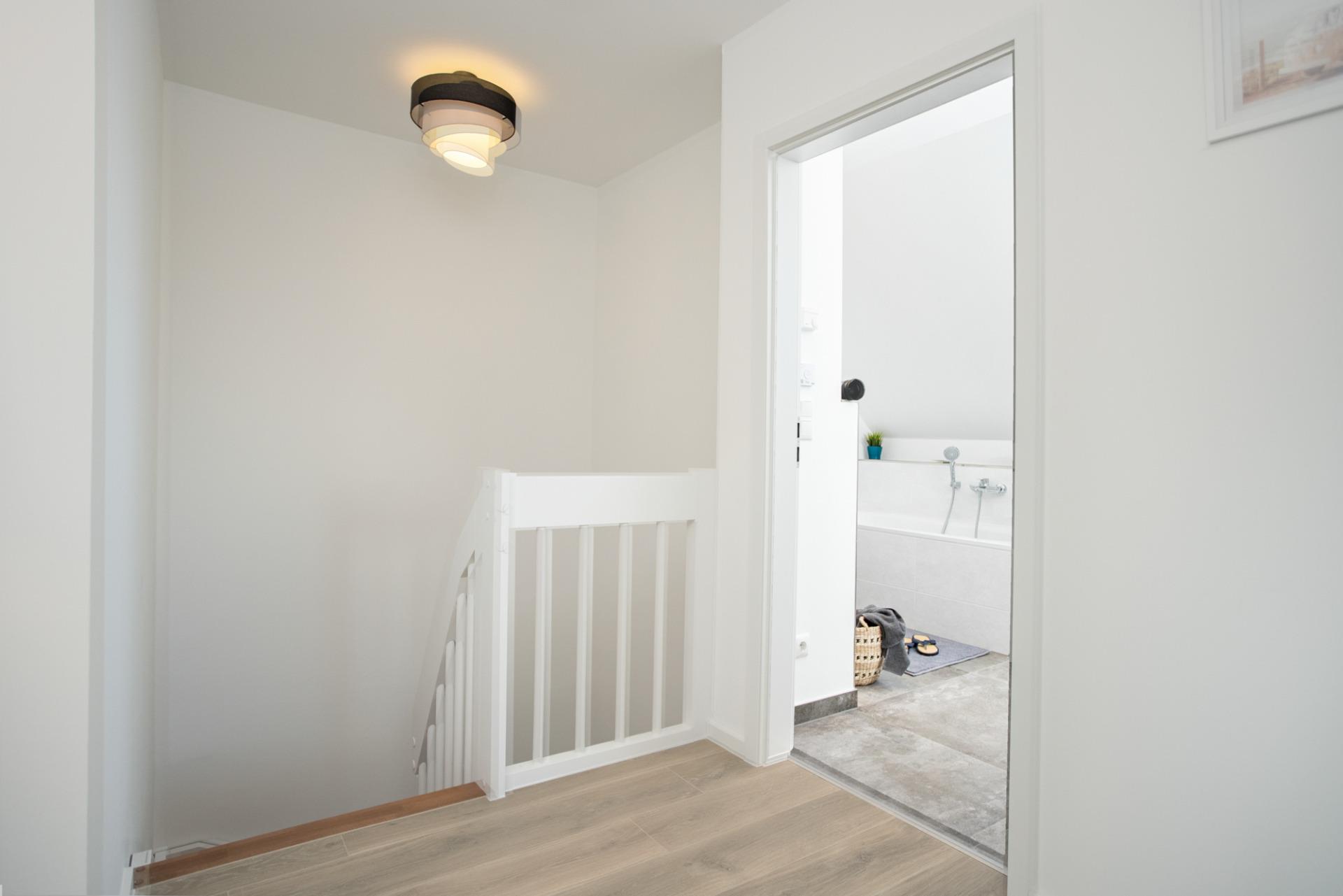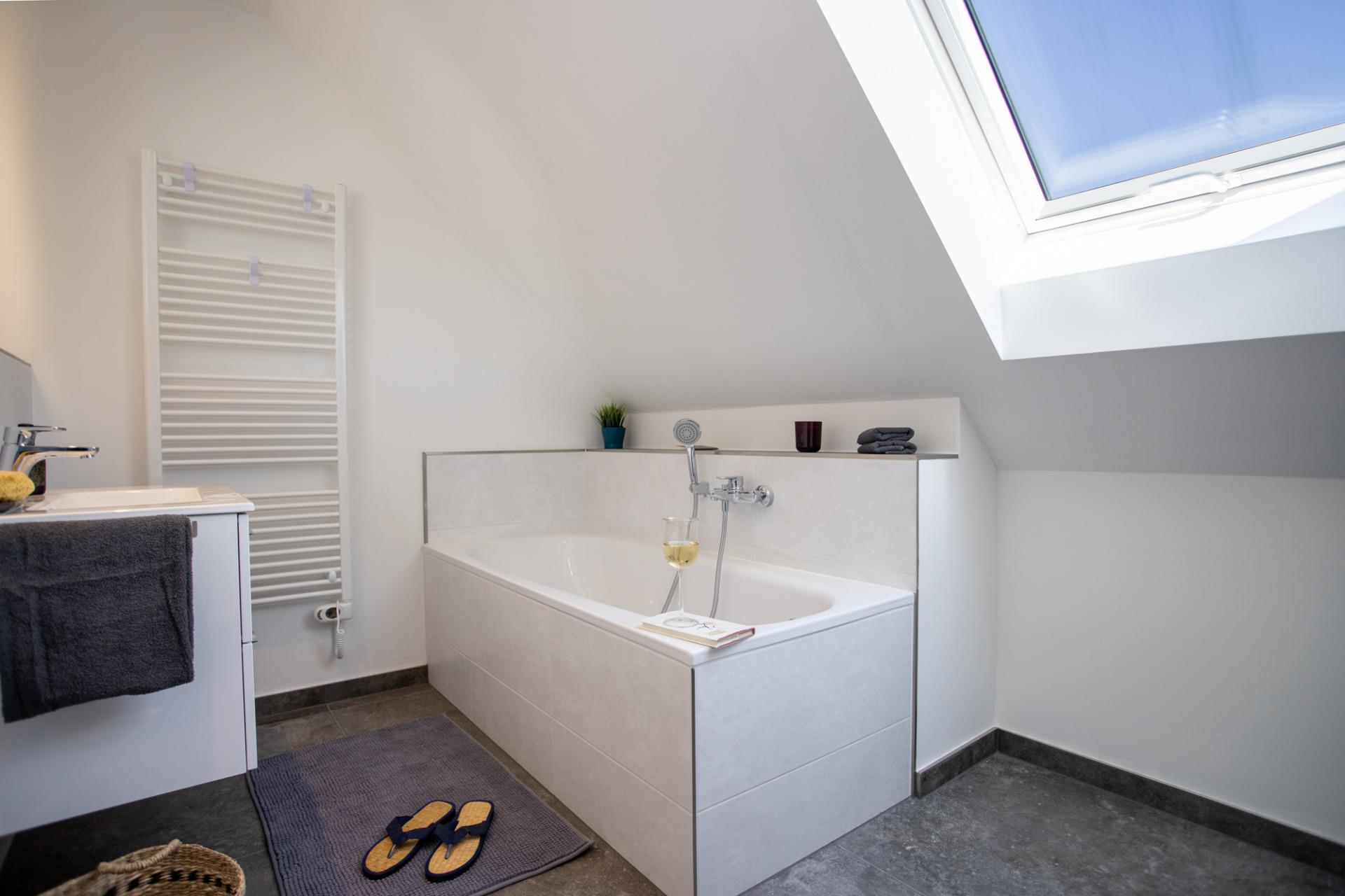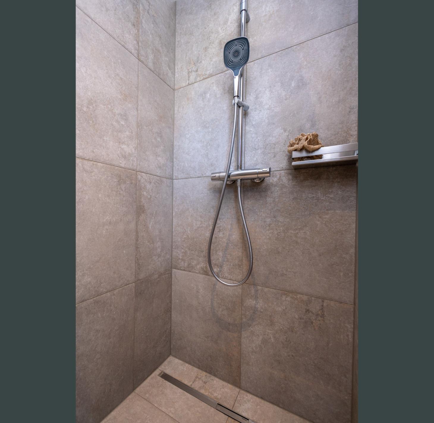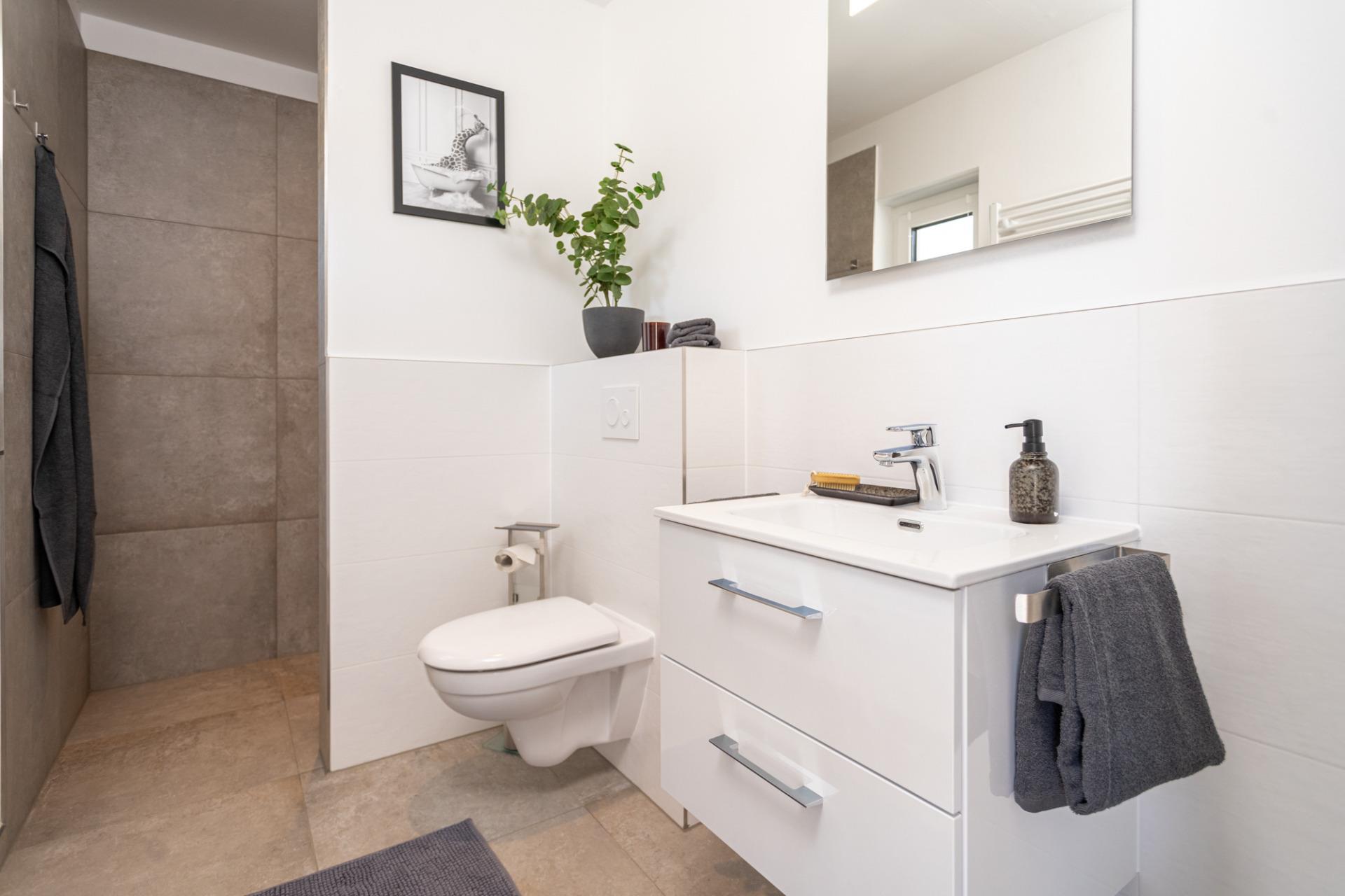 Das Haus bietet zwei moderne Badezimmer: im Obergeschoss ein Vollbad mit Badewanne und Schauerdusche, im Erdgeschoss ein weiteres Badezimmer mit Walk-in Schauerdusche.