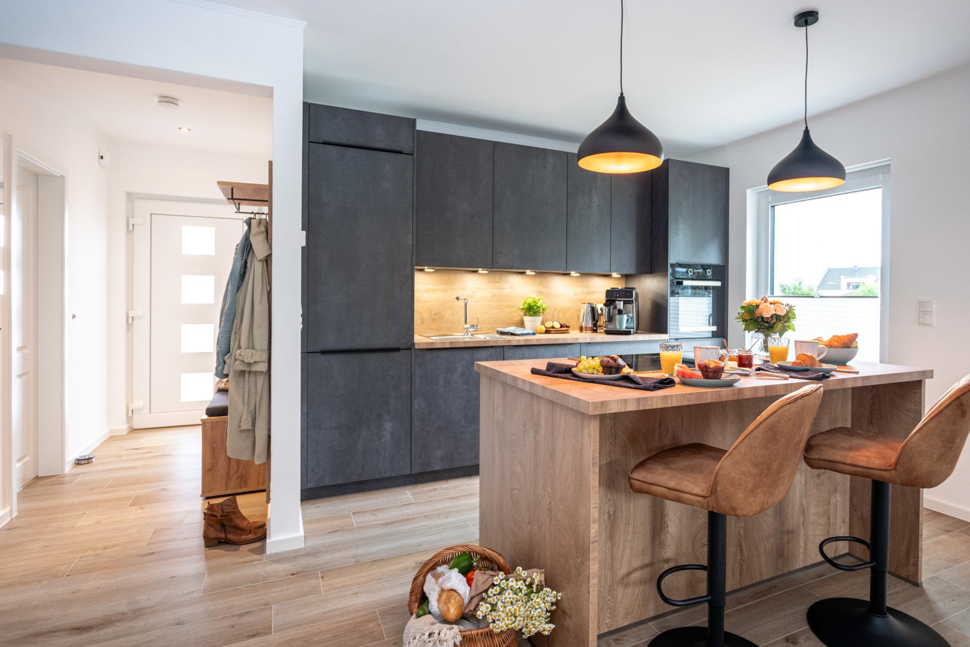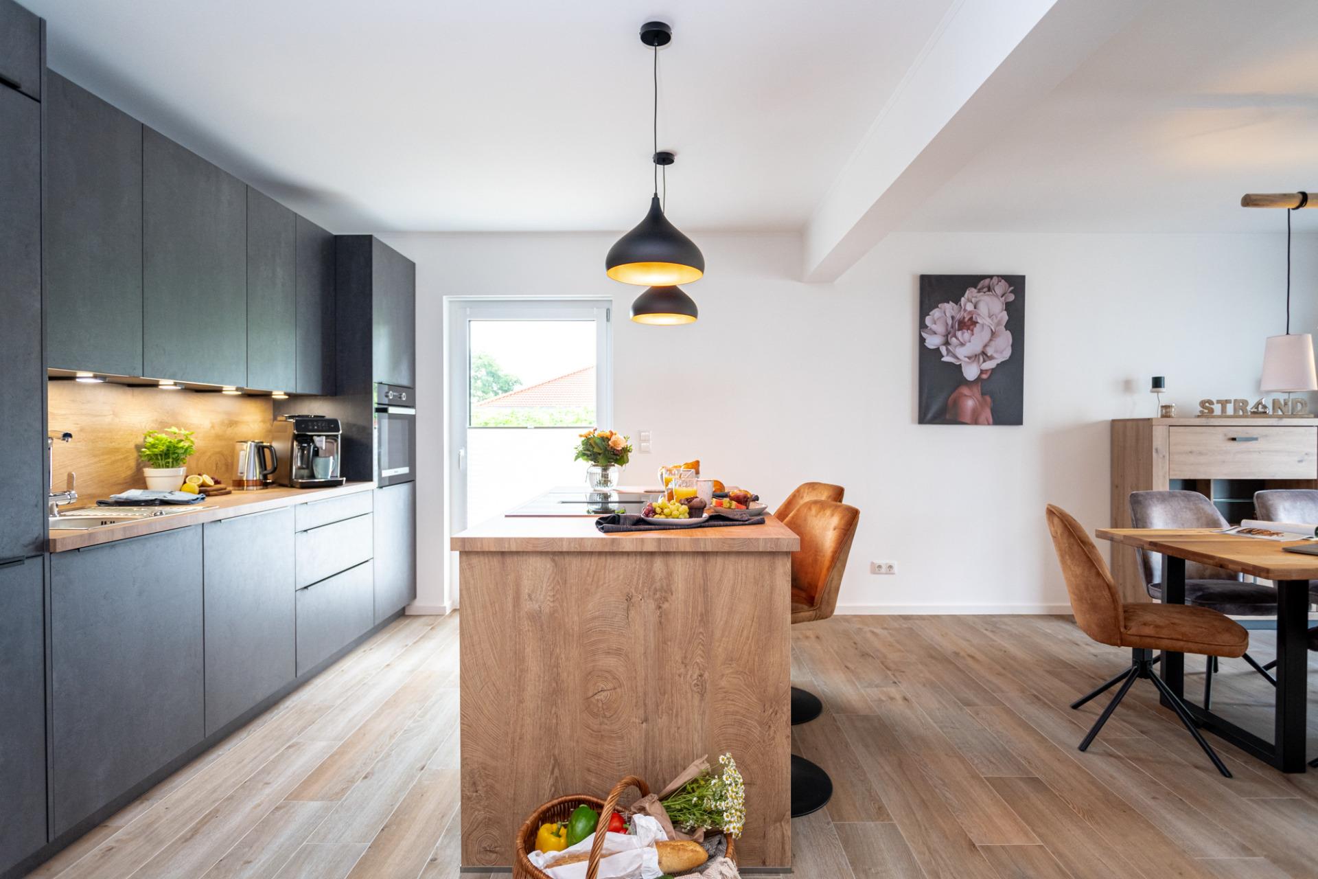Der offene Wohnbereich im Erdgeschoss kombiniert Wohnen, Essen und Kochen in einem großzügigen Raum. Der Wohnbereich lädt mit einem Kaminofen zu entspannten Abenden ein. Ein 55-Zoll-Flachbildschirm und ein Bluetooth-Sound-System sorgen für beste Unterhaltung. Die voll ausgestattete Wohnküche mit Inselblock und Tresen bietet hochwertige Geräte, darunter Herd, Backofen, Kühl- und Gefrierschrank, sowie einen Kaffeevollautomaten, Kaffeemaschine, Mikrowelle, Toaster und Wasserkocher.