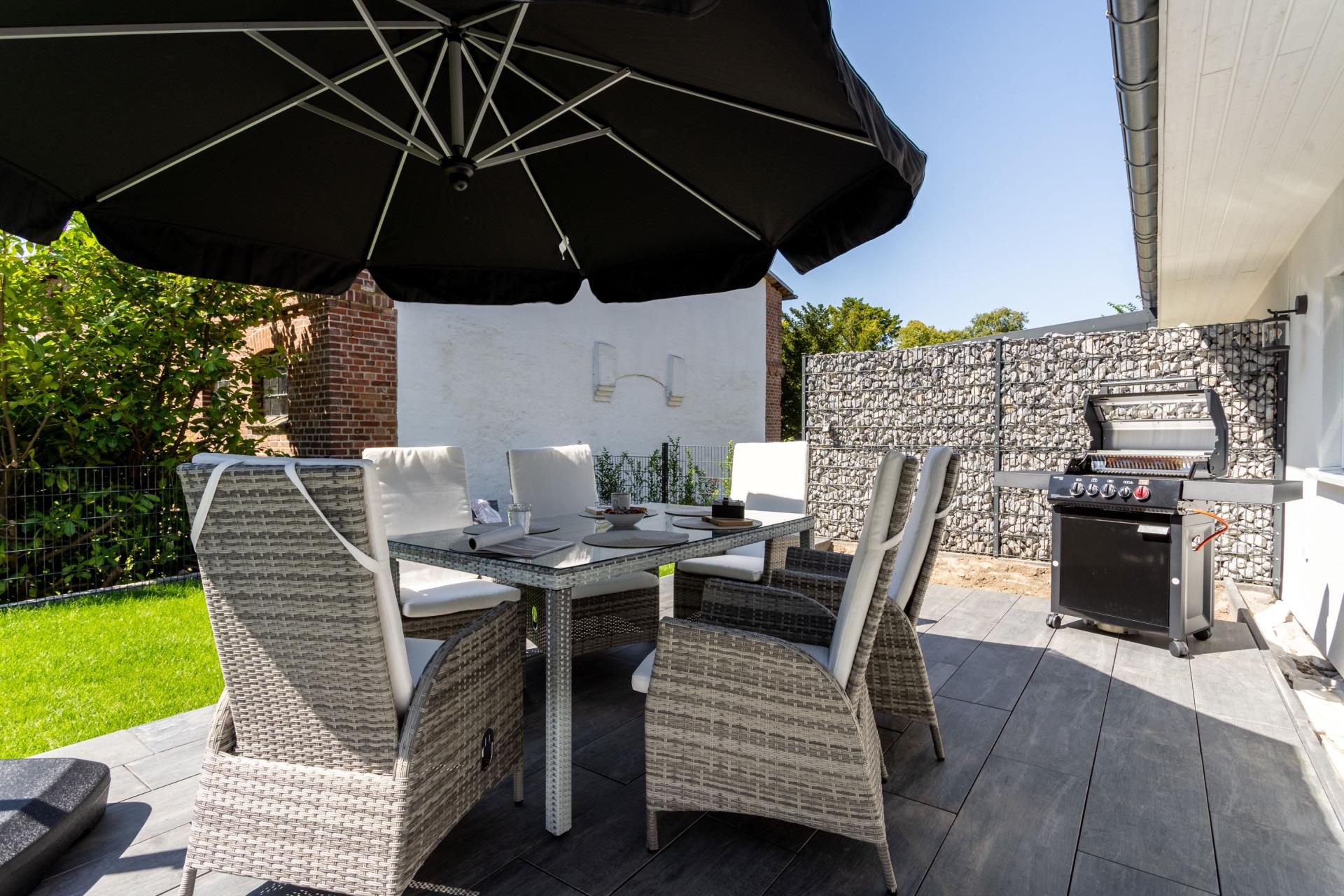 Vom Essbereich aus gelangen Sie auf die herrliche Terrasse, die mit verstellbaren Rattan-Sitzmöbeln, zwei Rattan-Sonnenliegen, einem XXL-Ampelsonnenschirm und einem 2-Personen-Strandkorb ausgestattet ist.