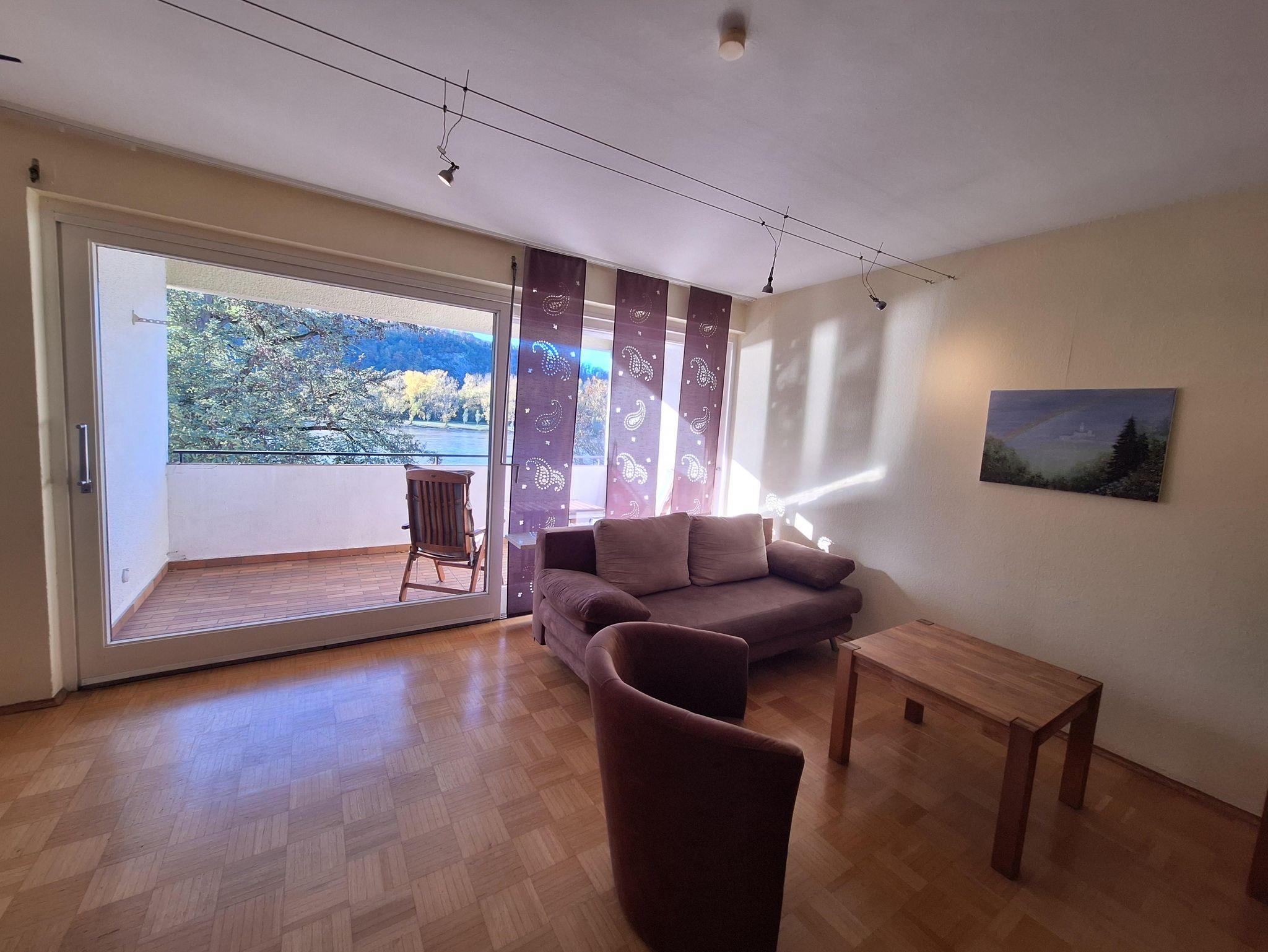 In dieser gemütlichen Ferienwohnung erwartet Sie ein offener, heller Wohnraum mit gemütlicher Sitzecke, TV und einem großen Fenster, das einen wunderschönen Blick auf den Rhein bietet. Der eingerichtete Essbereich lädt zu gemeinsamen Mahlzeiten ein und die angrenzende Loggia ist der ideale Ort, um den Tag entspannt ausklingen zu lassen.