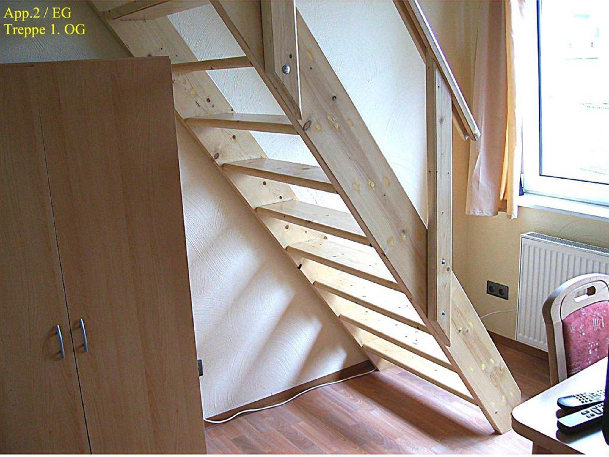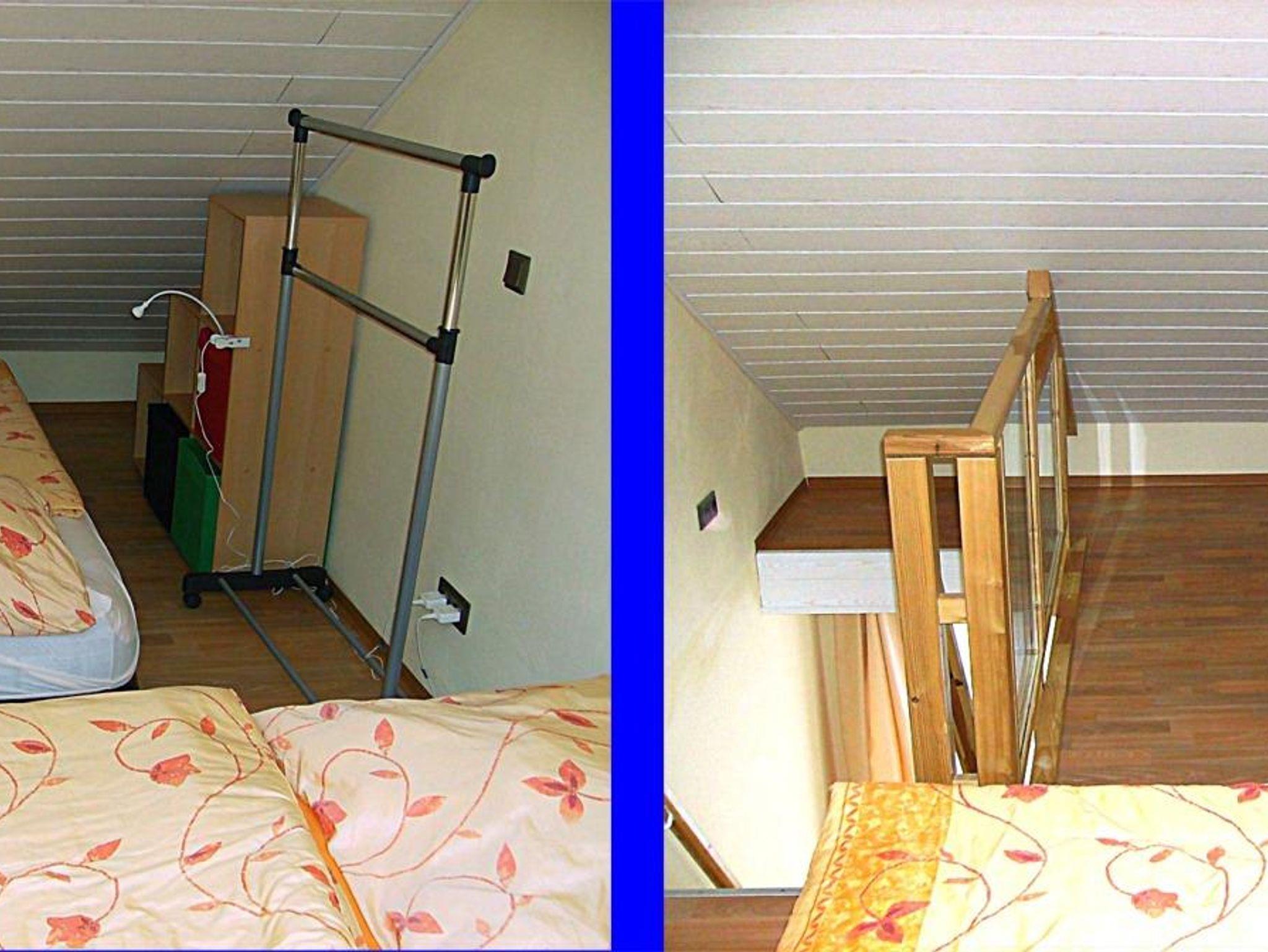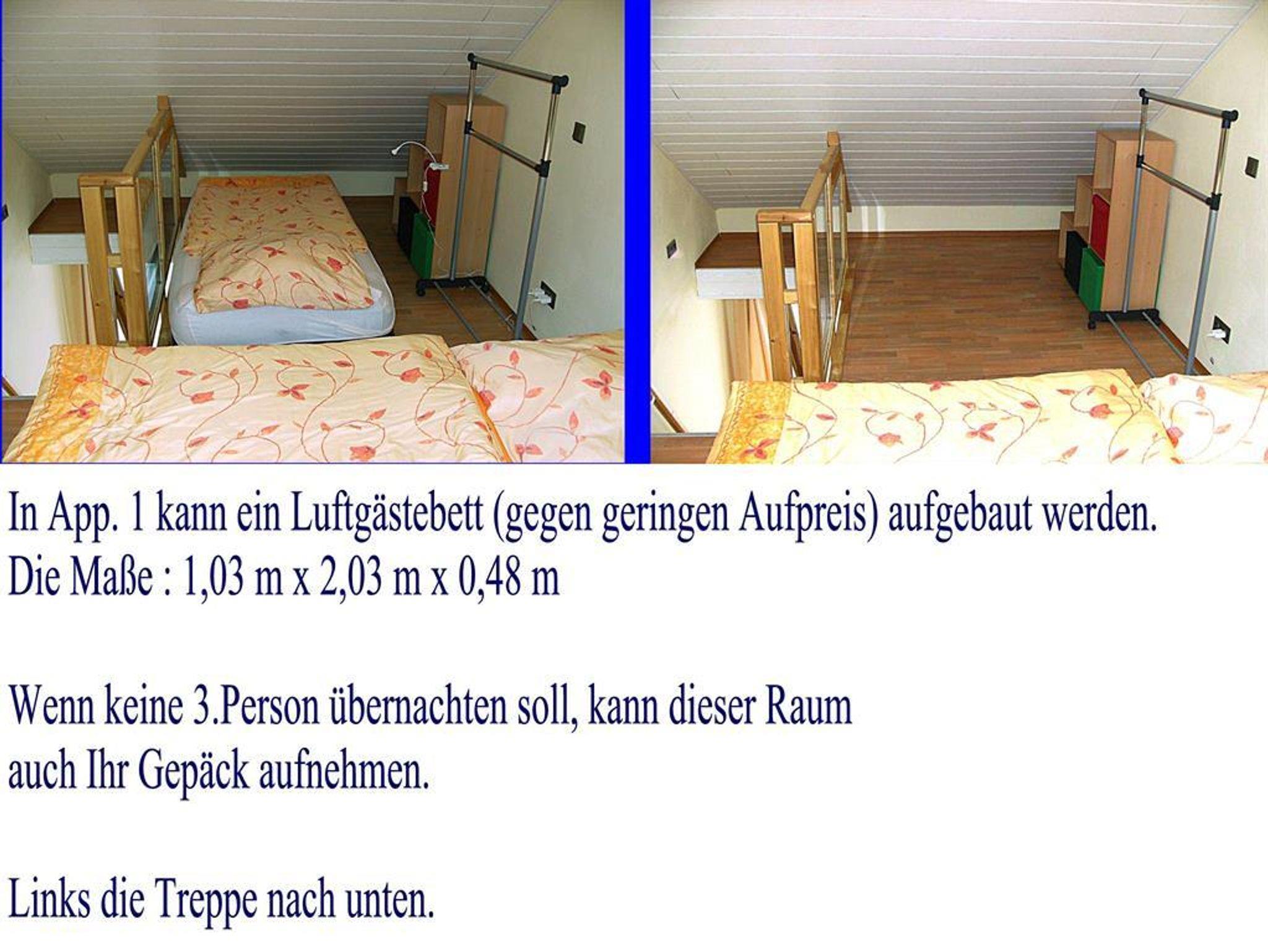 Nur App. 1 : Ein drittes Bett ist aufstellbar. Wir bieten hier ein Luftgästebett (203x103x46 cm) an, für Kleinkinder gibt es ein Kinderreisebett, ohne Zubehör. Ablagemöglichkeiten für die Kleidung ist im Schrank im EG oder im 1 OG fahrbarer Kleiderständer, sowie ein Stufenregal.
