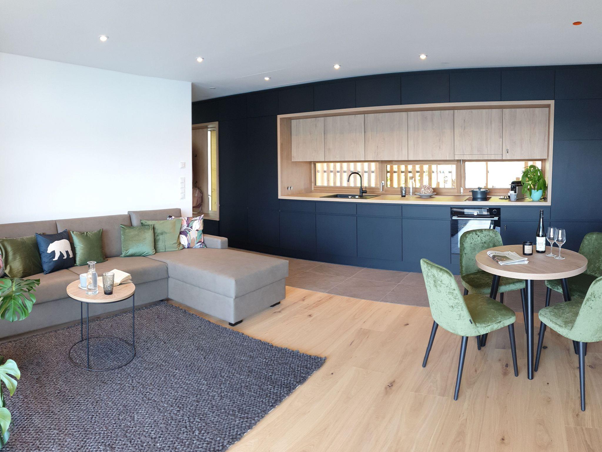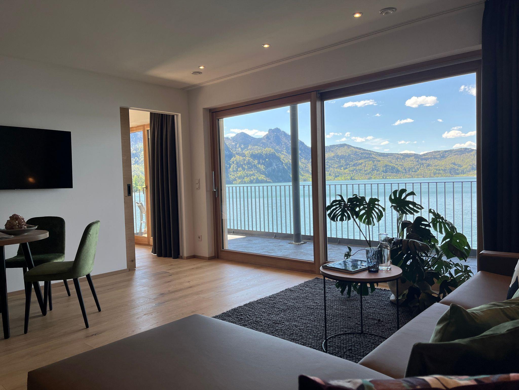 Die Apartments verfügen über ein Wohnzimmer (ca 20qm) mit gemütlichem Esstisch, einer Couch die man bequem in ein Zusatzbett umfunktionieren kann, einen großen Flat-TV für einen gemütlichen Fernseh-Abend und natürlich einen fantastischen Seeblick. Die integrierte und voll ausgestattete Designerküche ist mit einem Induktionsherd, Mikrowelle, Espresso- und Spülmaschine ausgestattet. Selbstverständlich sind Kochutensilien, Geschirr, Gläser etc. vorhanden.