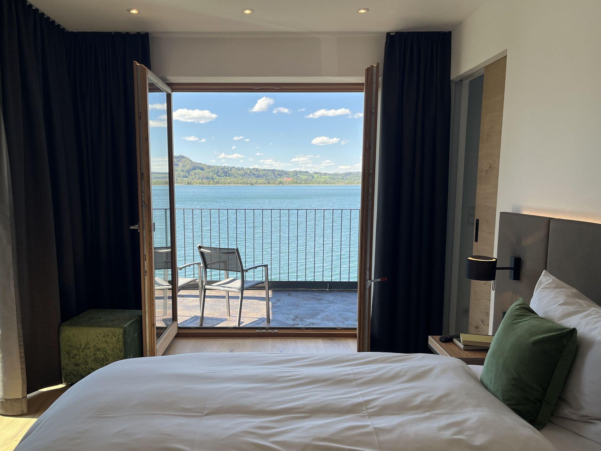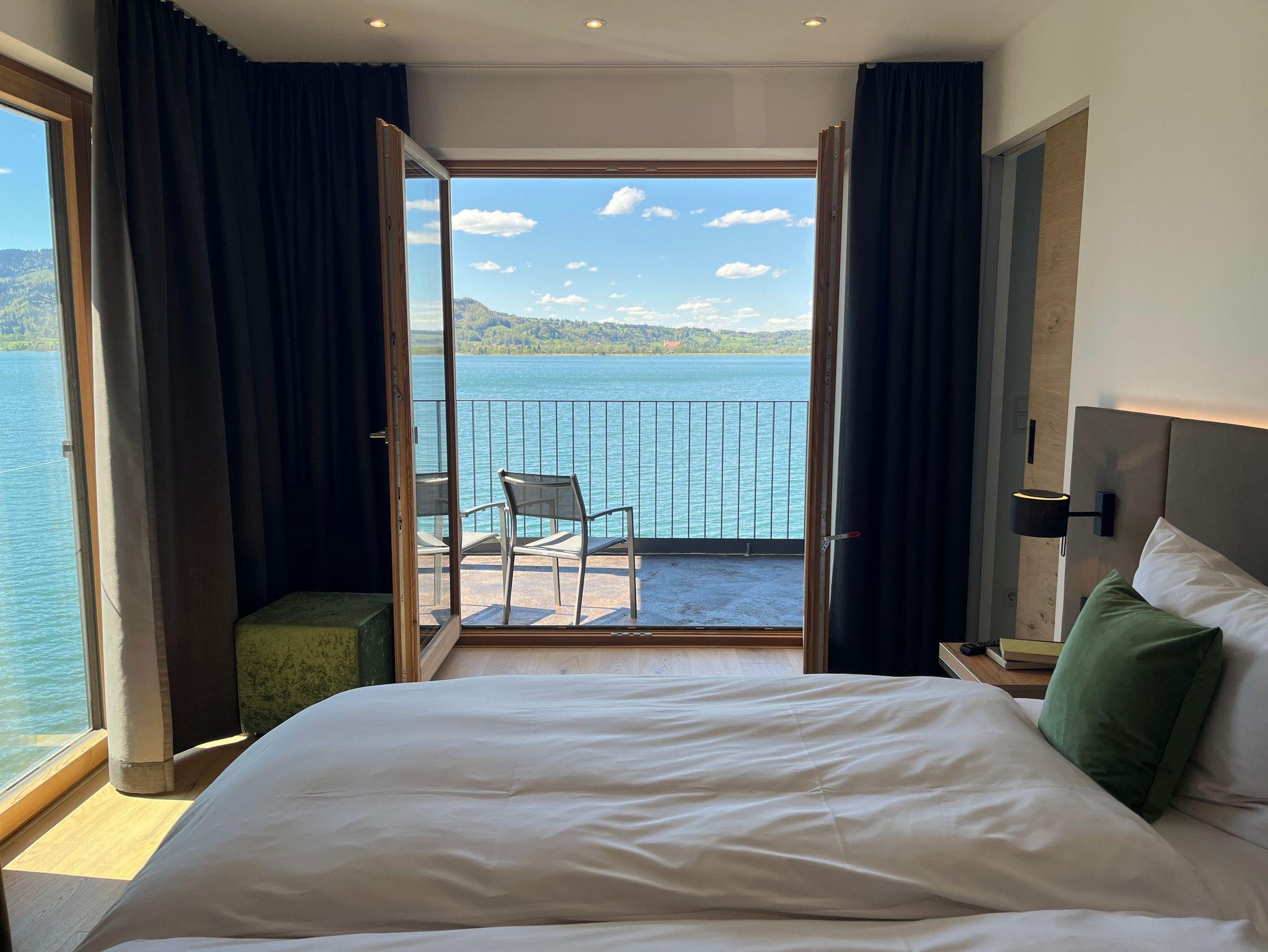 In das separate Schlafzimmer mit großem King-size Doppelbett (2x2 m) und (auch) Seeblick, ist ein großer Schrank eingebaut in dem auch ein kleiner Arbeitsplatz integriert ist (Thema „Workation“). Das Badzimmer mit Fußbodenheizung und begehbaren Dusche verfügt über einen direkten Zugang zum Balkon auf dem sich die kleine private Sauna befindet.