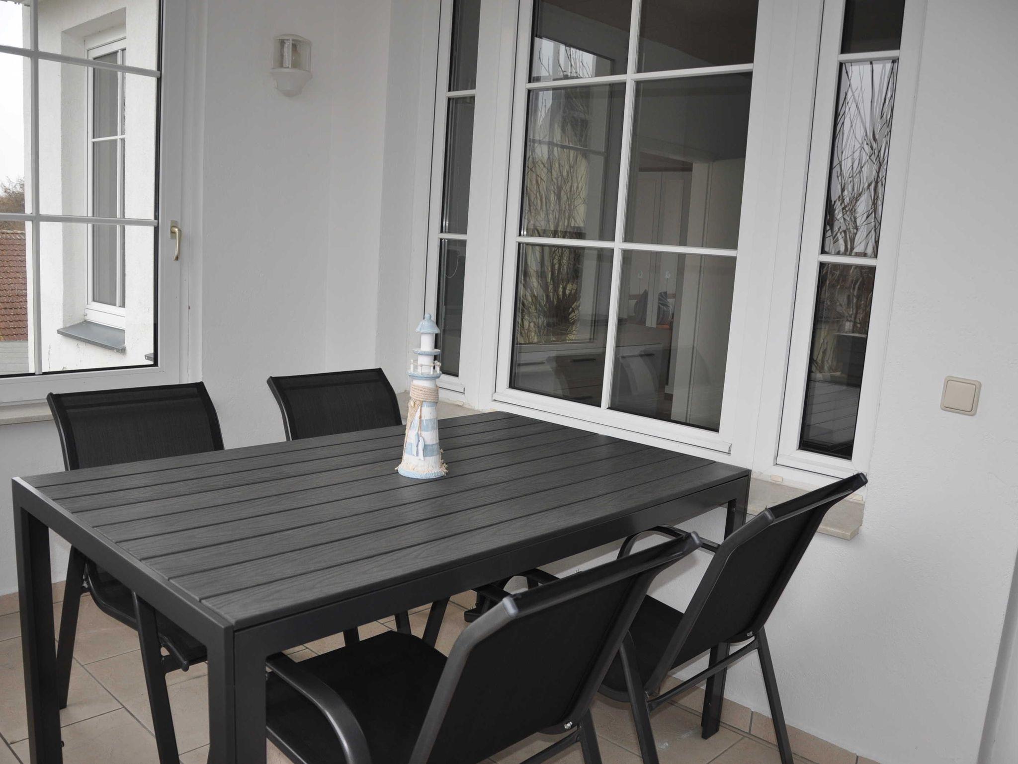 Moderne Ferienwohnung Achtern in Koserow mit Balkon, Küche und kostenfreien Parkplätzen für erholsamen Urlaub am Meer.
