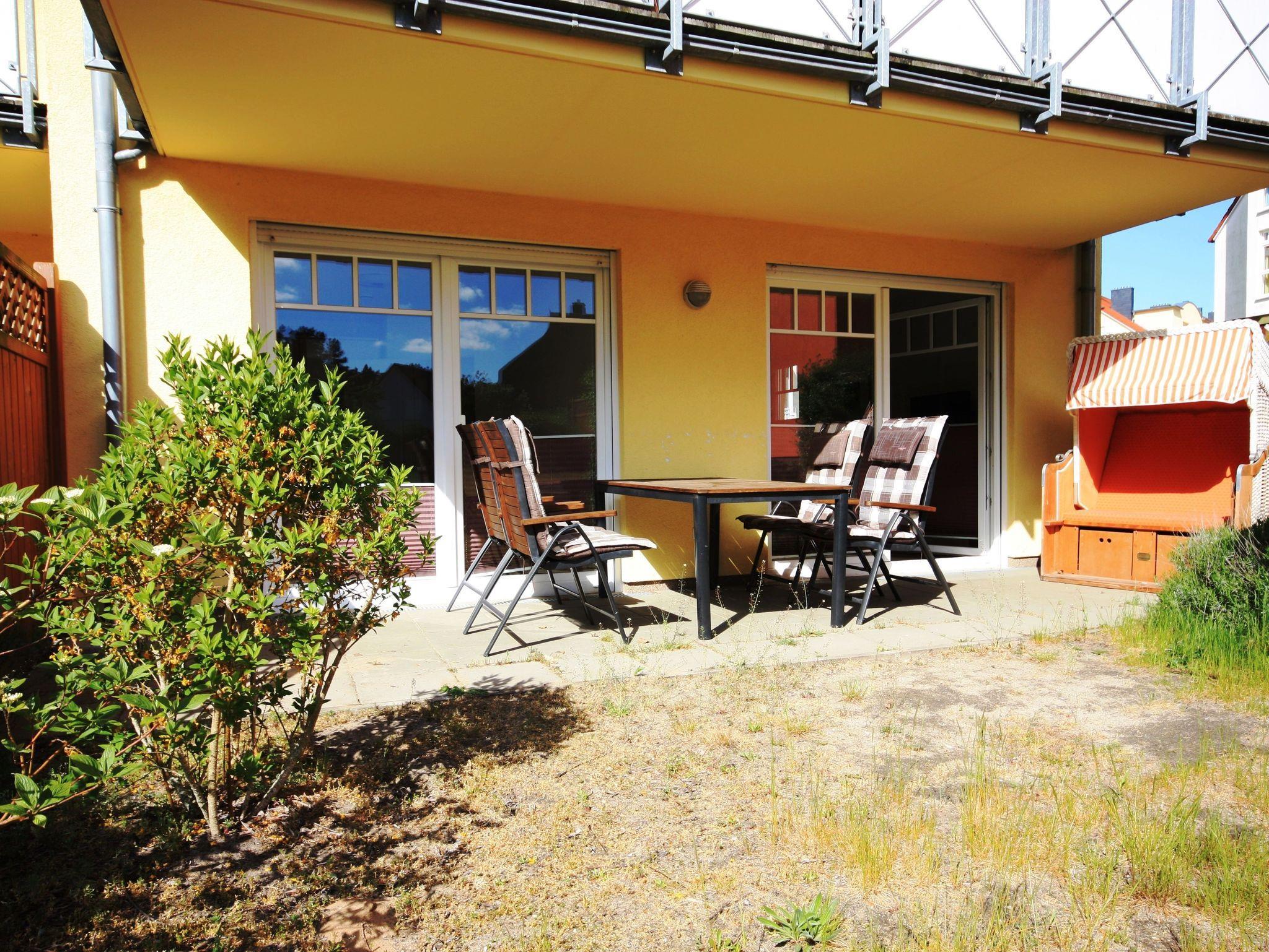 • Südterrasse mit Gartenmöbeln, Sonnenschirm, tlw. Strandkorb