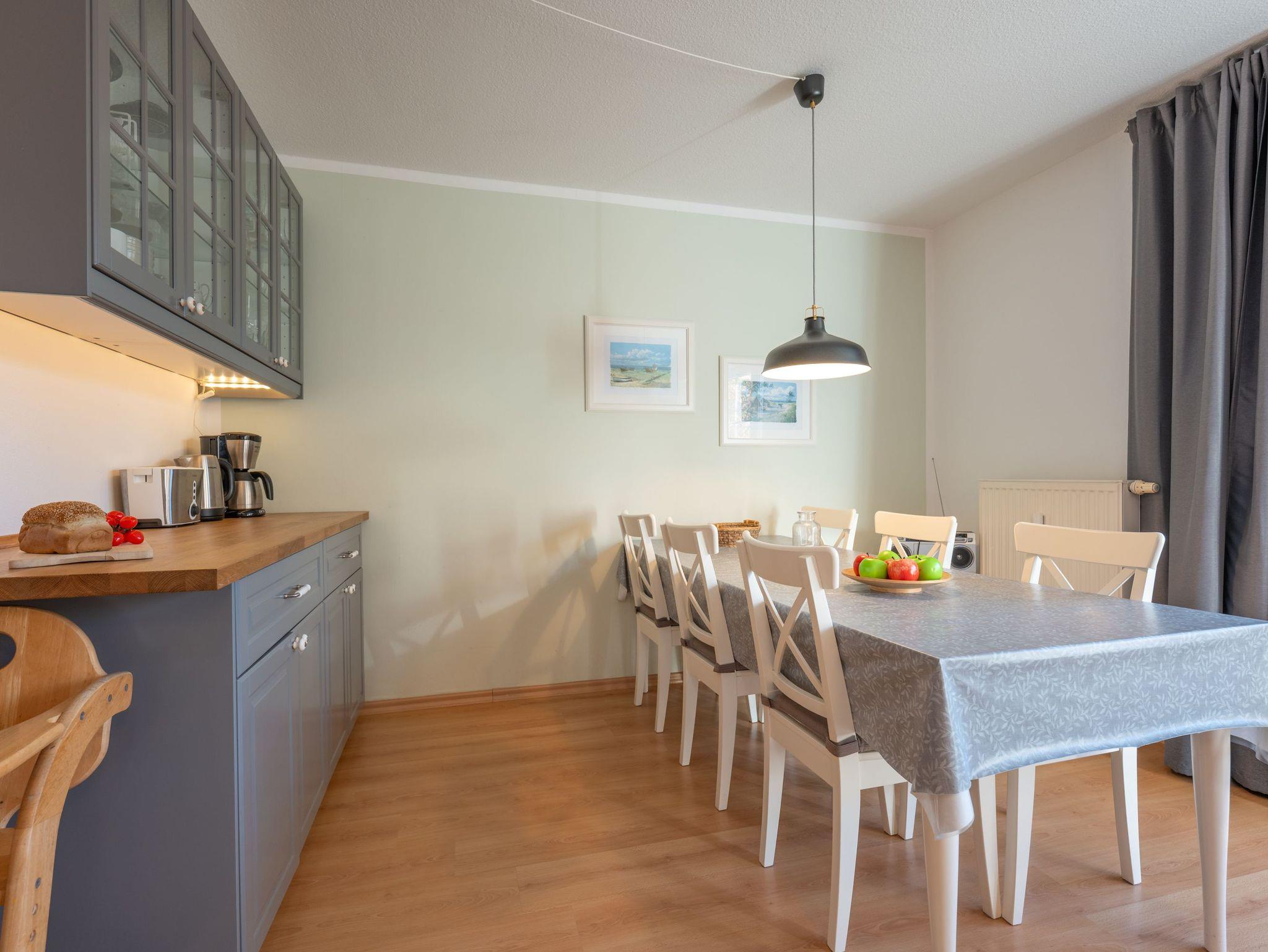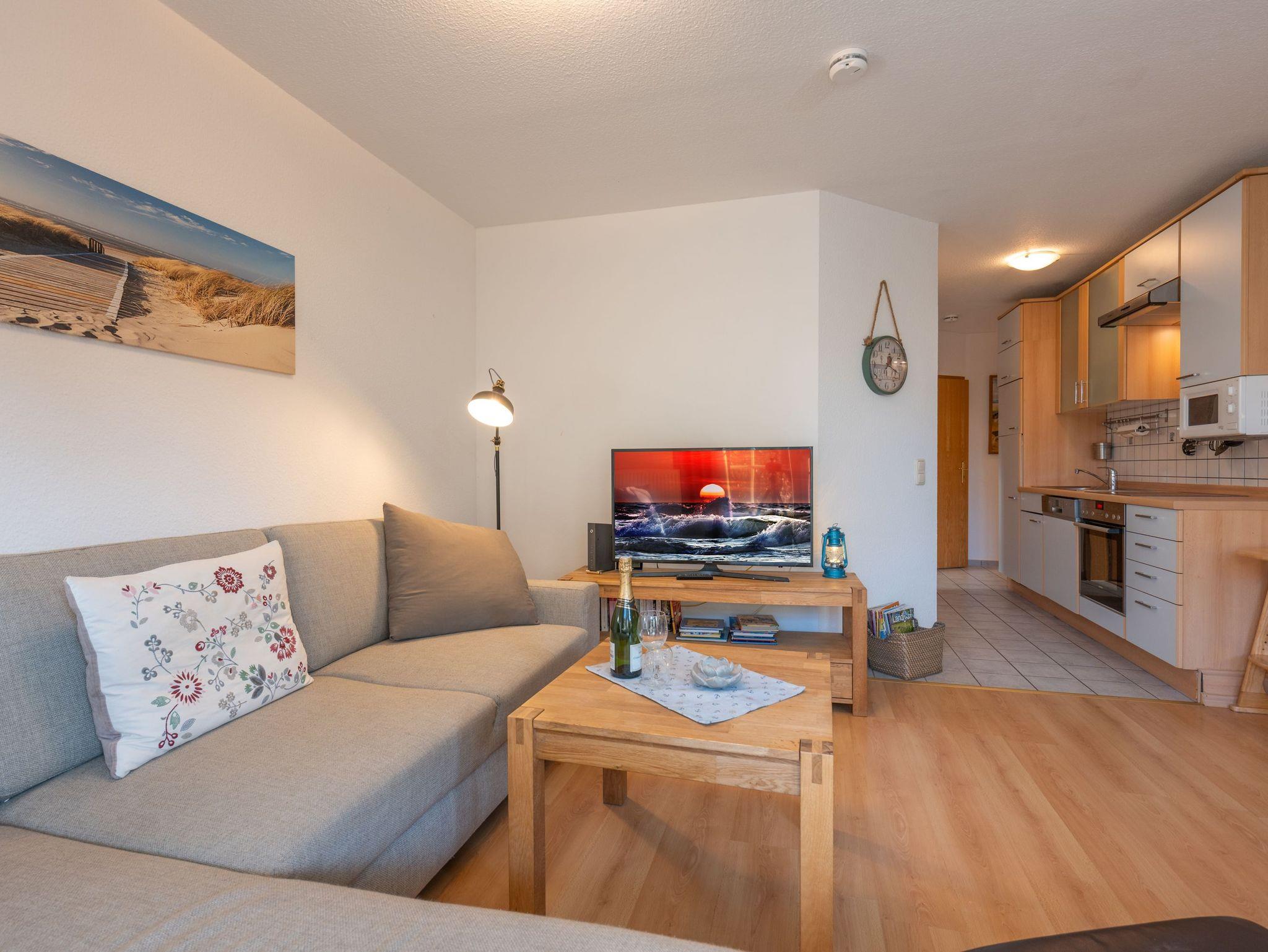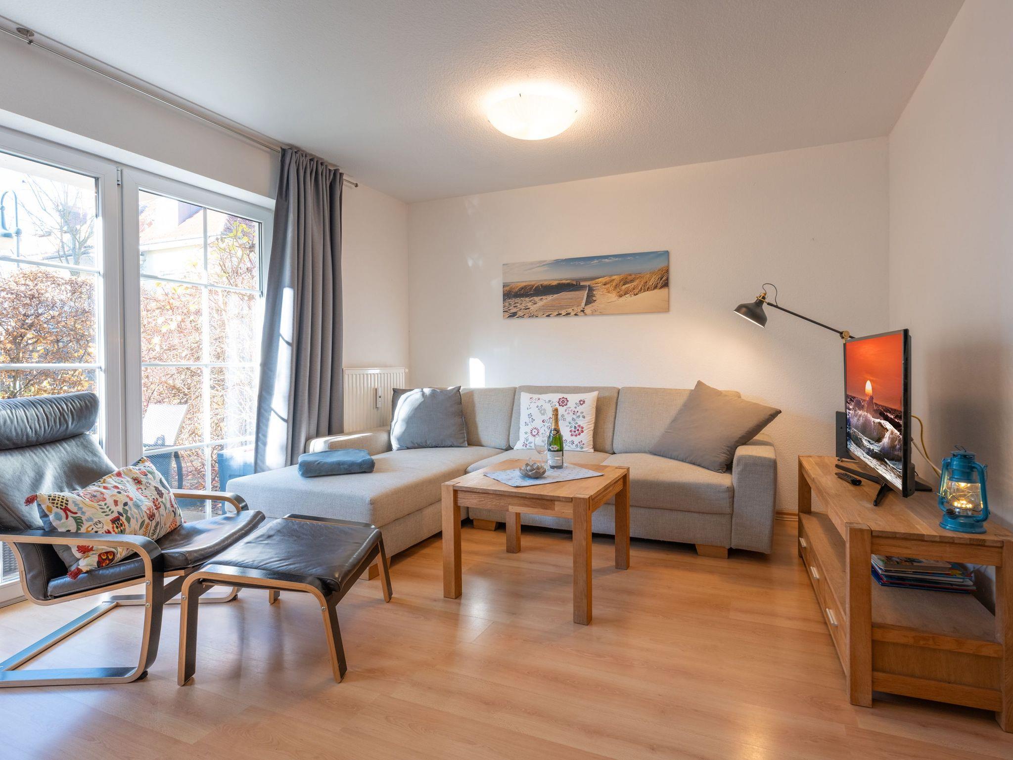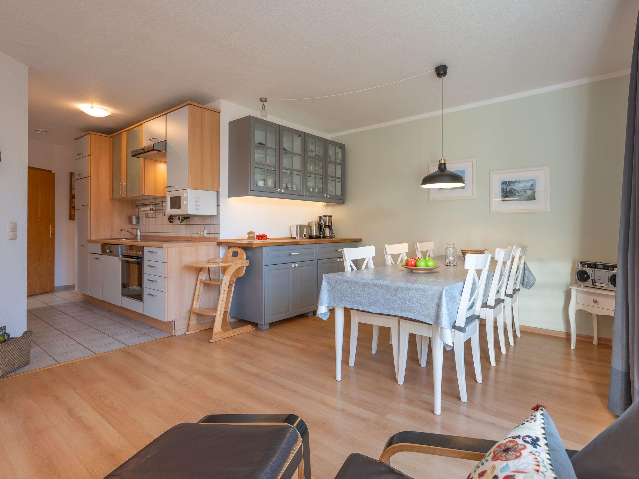Der liebevoll eingerichtete Wohn- und Essbereich lädt mit einer bequemen Sitzecke, Flachbild-TV und Radio zu entspannten Stunden ein. Von hier aus gelangen Sie direkt auf die möblierte Terrasse, auf der Sie den Tag bei einem Frühstück an der frischen Ostseeluft oder einem Glas Wein am Abend ausklingen lassen können.