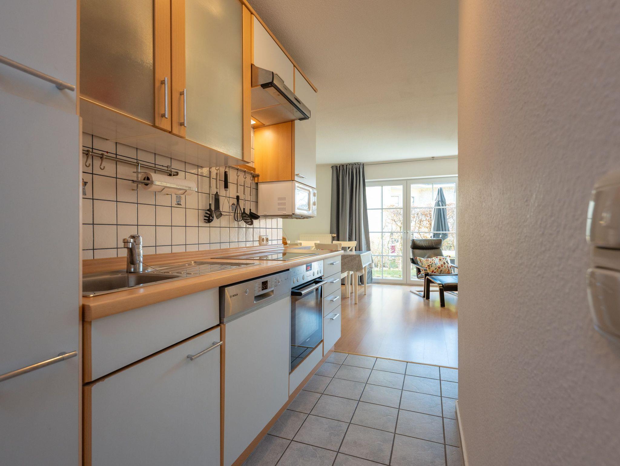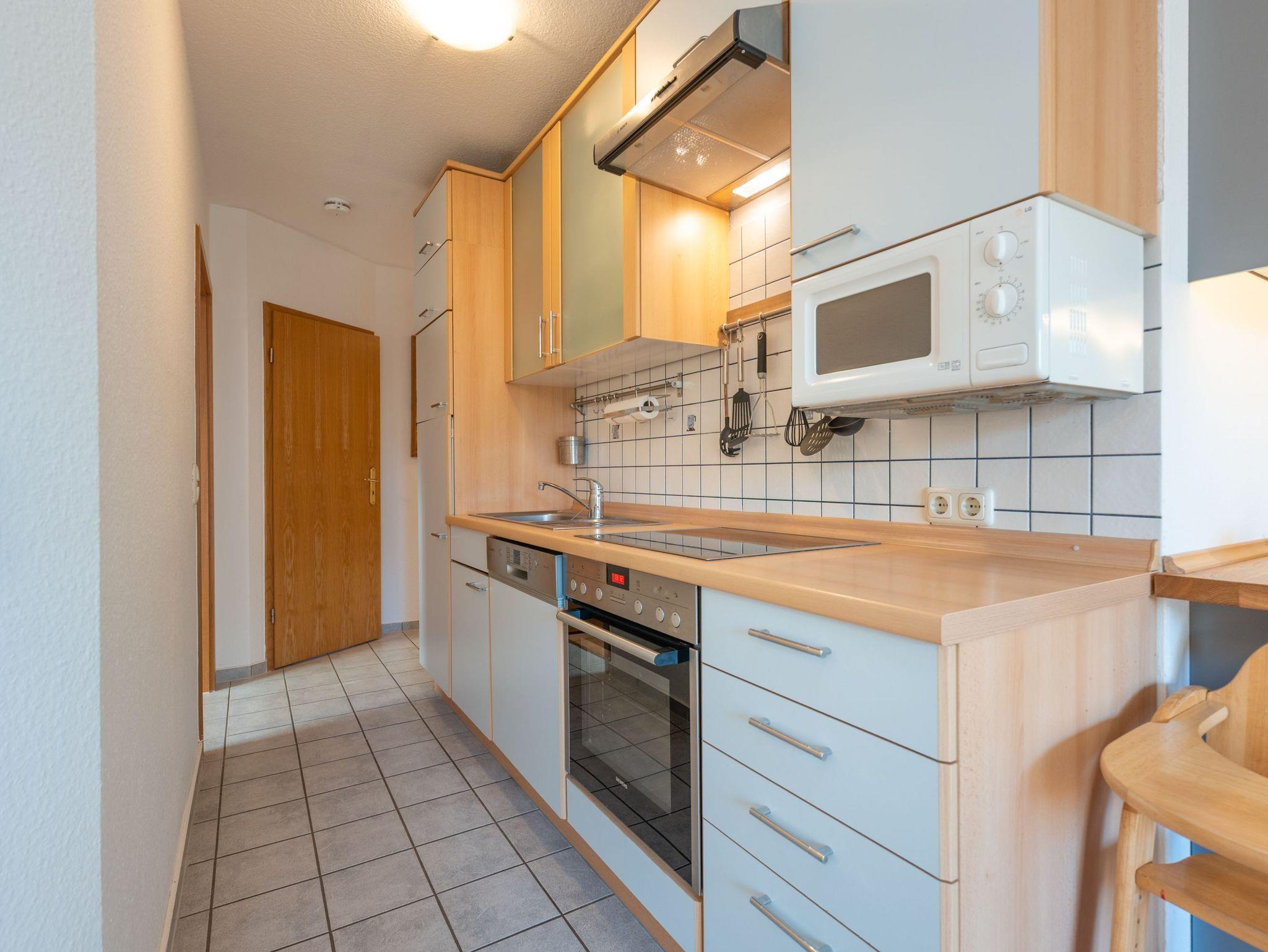 Die offene Küchenzeile ist vollständig ausgestattet und lässt keine Wünsche offen: mit Backofen, Geschirrspüler, Glaskeramikkochfeld, Mikrowelle, Toaster und Wasserkocher ist sie perfekt für Selbstversorger geeignet.