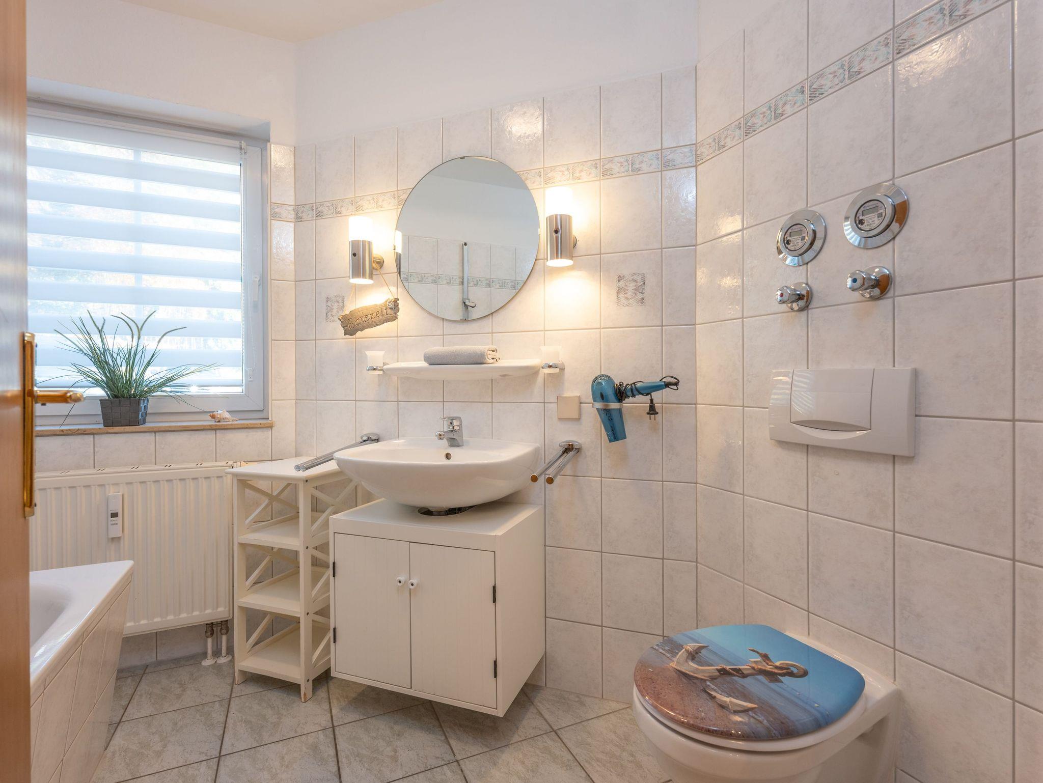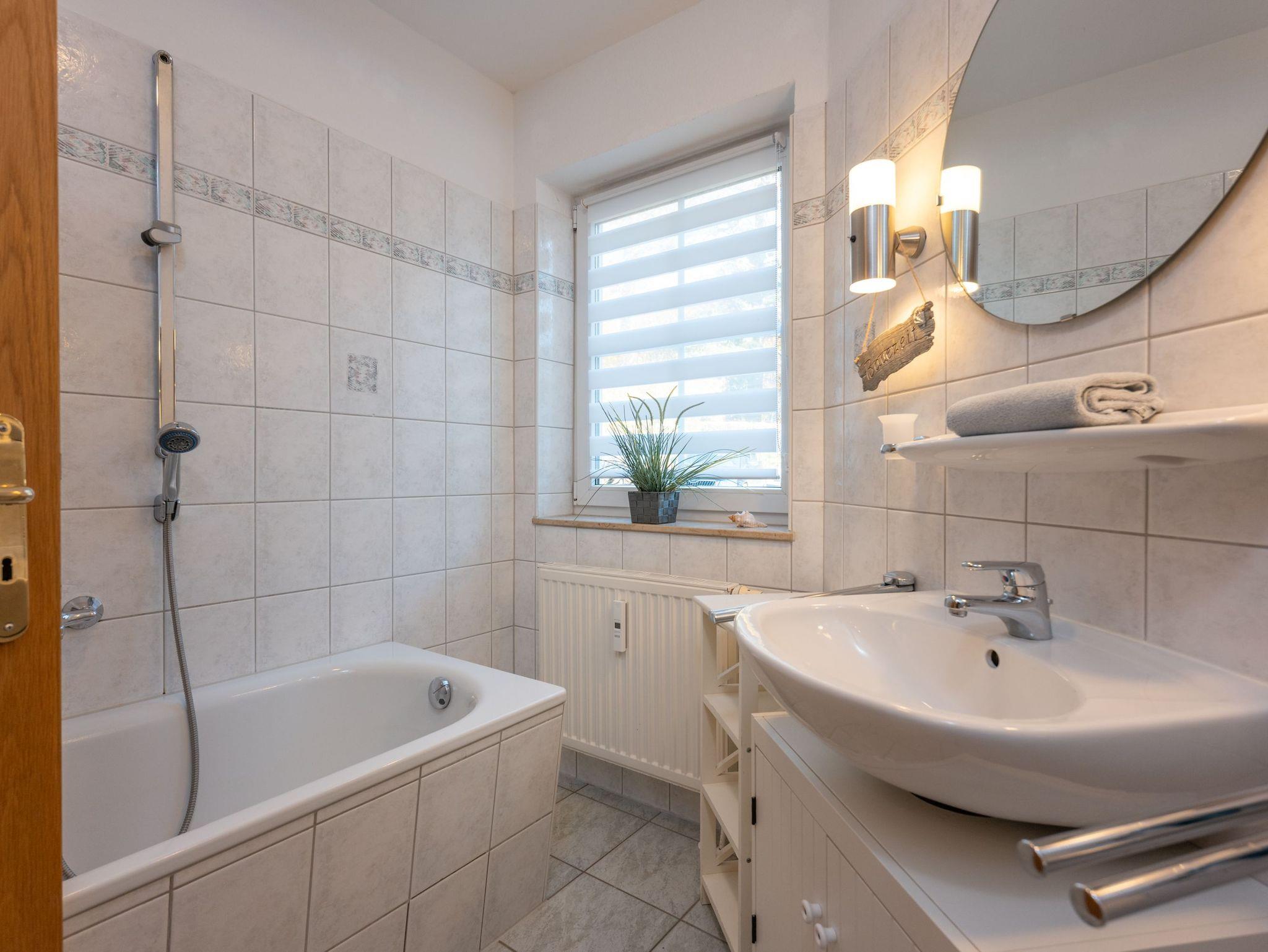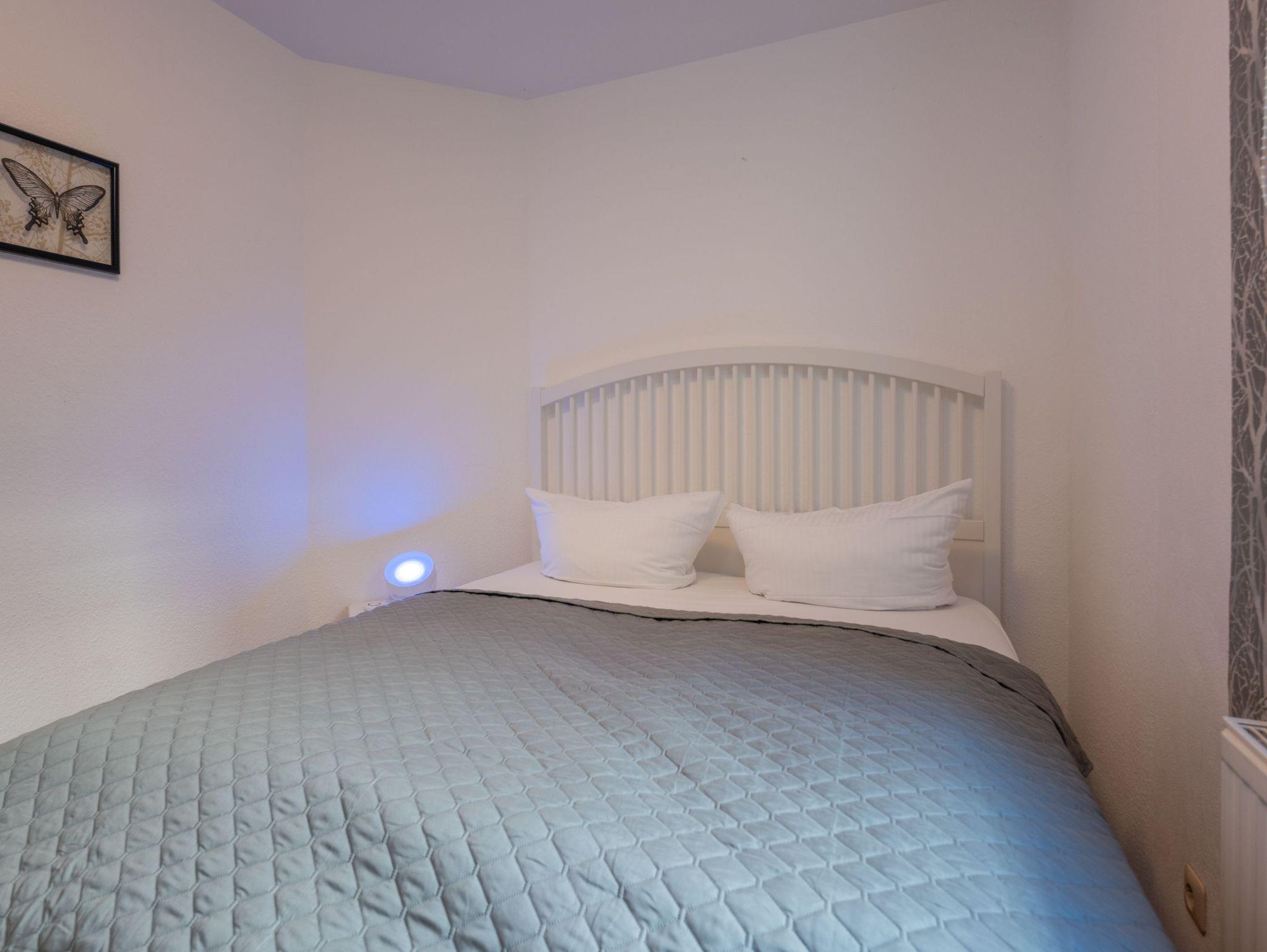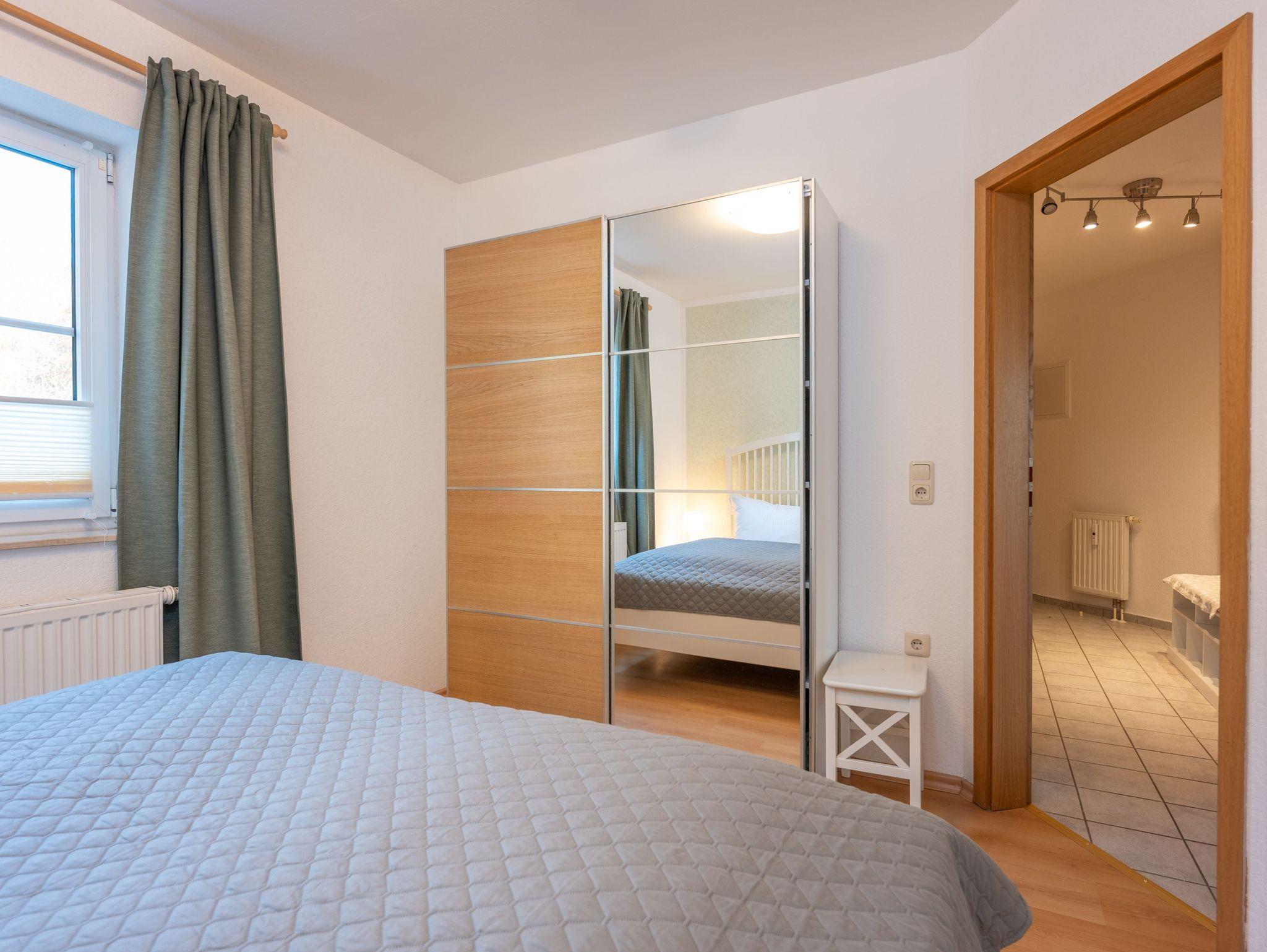 Zwei separate Schlafzimmer sorgen für erholsame Nächte eines mit einem komfortablen Doppelbett (180 x 200 cm), das andere mit einem Doppelbett (160 x 200 cm). Das Badezimmer verfügt über Badewanne, WC und Waschbecken.