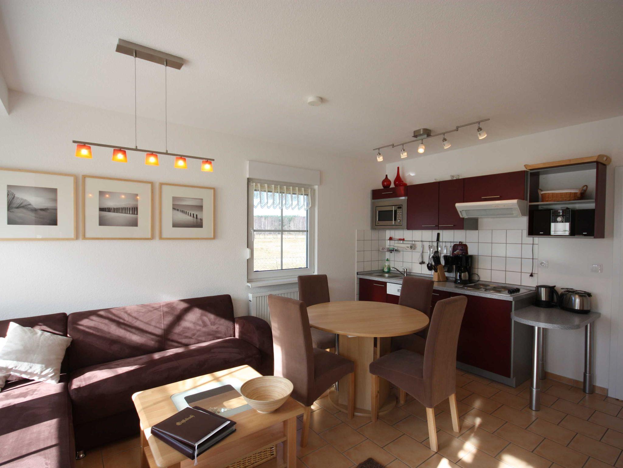 Die Ferienwohnung liegt im Erdgeschoß des Ferienhauses. Sie besteht aus Wohnzimmer, kompl. ausgestatteter Küche, Schlafzimmer und Tageslichtbad mit Waschmaschine. Die Ausstattung der bordeauxfarbenen Einbauküche ist funktional und qualitativ hochwertig unter anderem mit Toaster, Kaffeemaschine, Mikrowelle mit Grill, 4-fach Kochfeld, Geschirrspüler, Gefrierfach. Von der großen Süd-Terrasse und aus dem Küchenfenster hat man einen fantastischen Blick auf die Wiesen Richtung Achterwasser. Sie verfügt über einen kleinen Elektroedelstahleffektkamin.