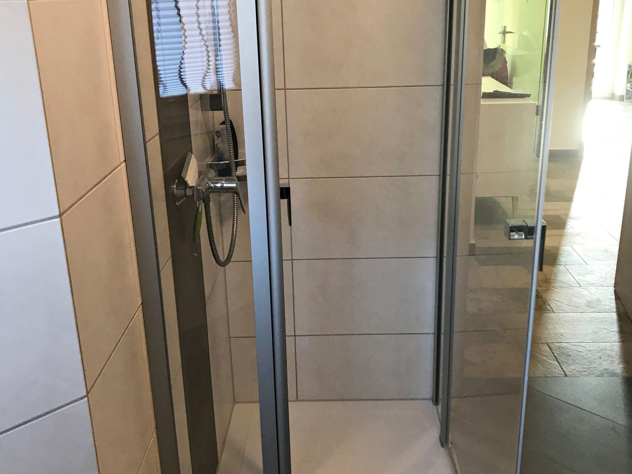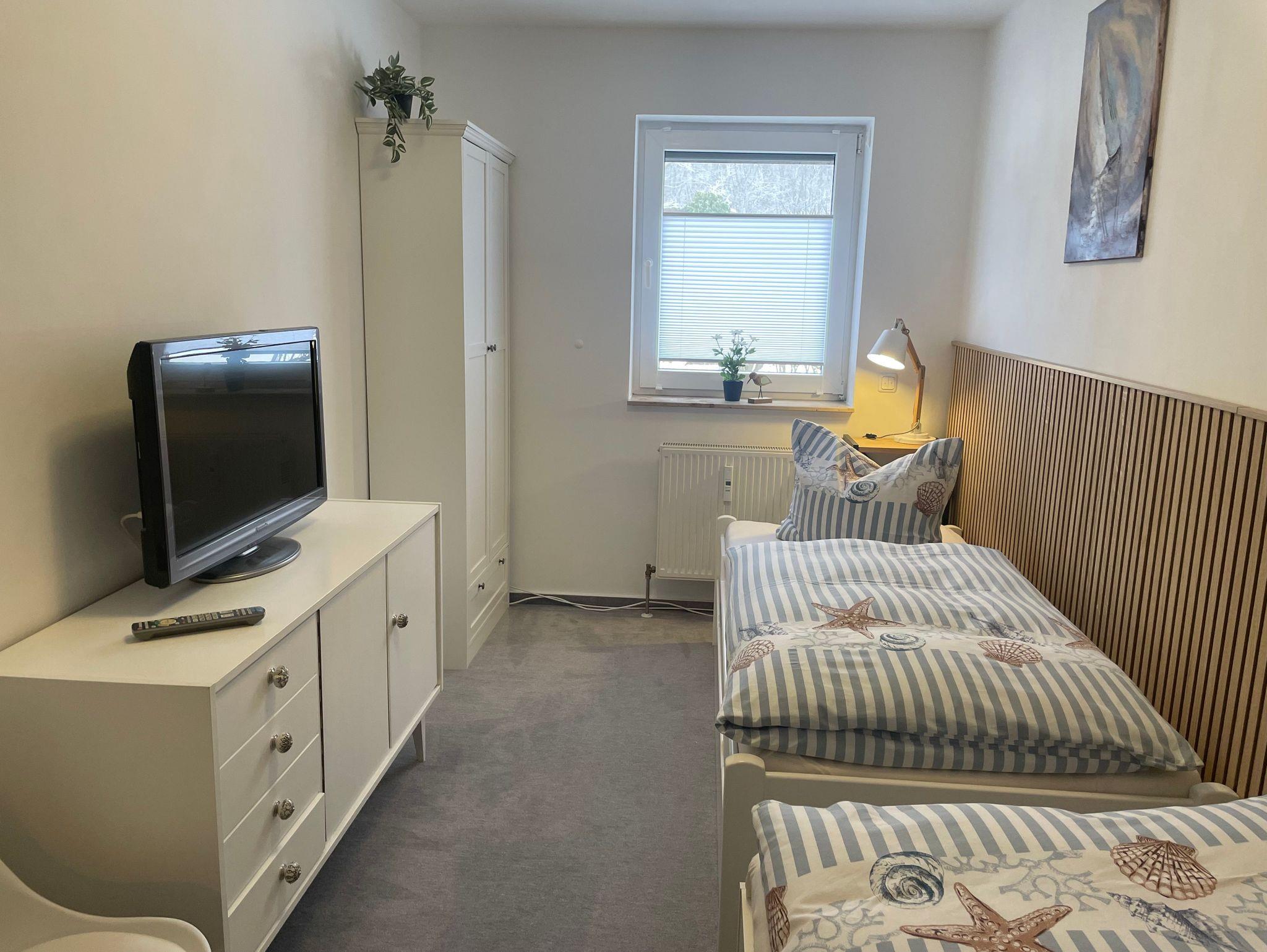1 Wohnraum mit TV und Zugang zur Terrasse