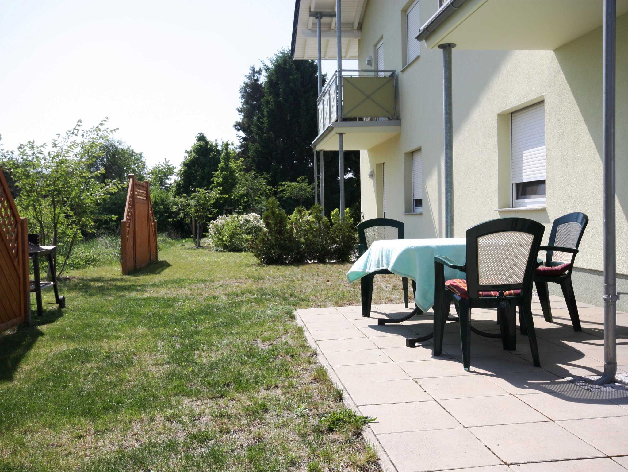 • Terrasse mit Tisch, Stuhl, Sonnenschirm