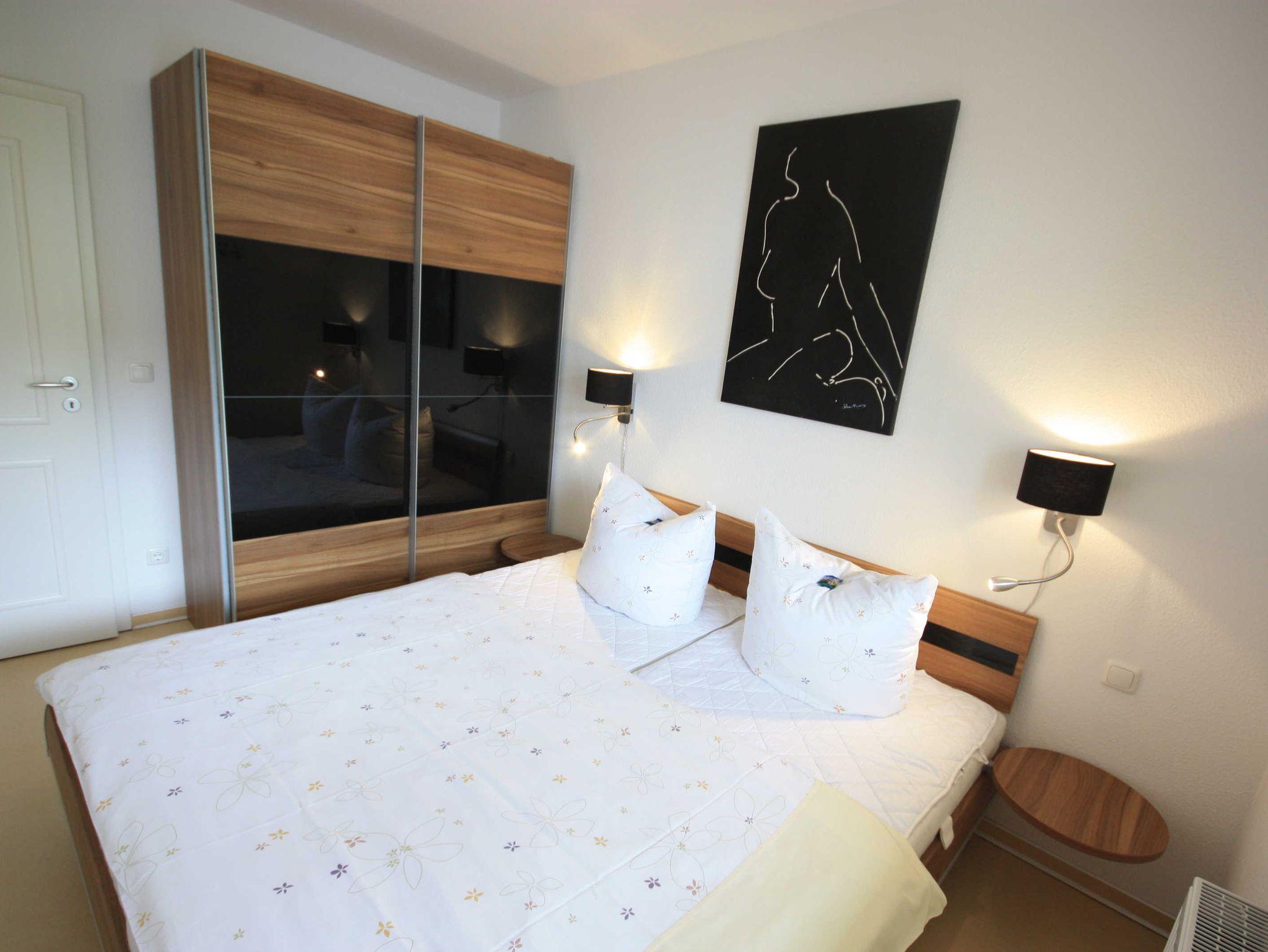 Die Ferienwohnung liegt im Obergeschoß des Ferienhauses links vorne. Sie besteht aus Wohnzimmer, kompl. ausgestatteter Küche, Balkon, Schlafzimmer und Tageslichtbad. Nußbaum-Schlafzimmer mit schwarzen Applikationen und Spiegelflächen. Ein Highlight stellt die schwarze Hochglanzeinbauküche mit qualitativ hochwertigen Einbaugeräten, u.a. Toaster, Kaffeemaschine, Mikrowelle mit Grill, Ceran-Kochfeld und Geschirrspüler dar. ein 80cm Fernseher mimt DVD-Rekorder und ein schwarzes Velourledersofa runden die Ausstattung ab. Großer Süd-Balkon mit Holzmöbeln.
