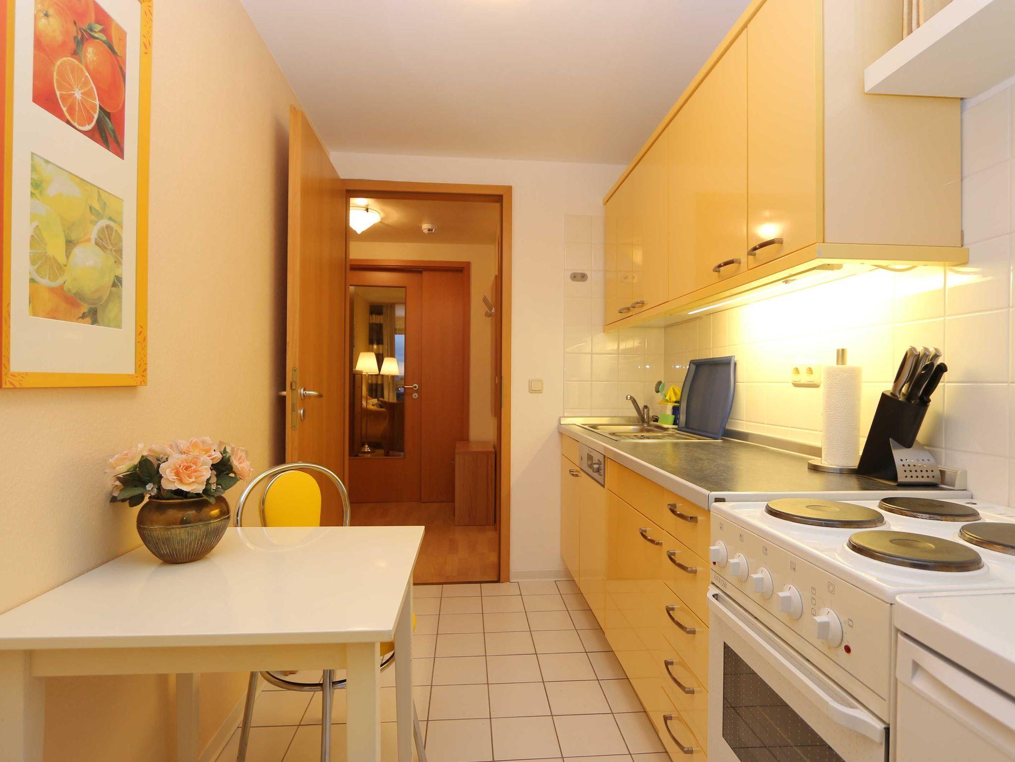 • komplett eingerichtete Einbauküche mit Herd, Spülmaschine, Kühlschrank ohne Gefrierfach, Toaster, Kaffeemaschine, Wasserkocher, Eierkocher, reichlich Geschirr und Essplatz
