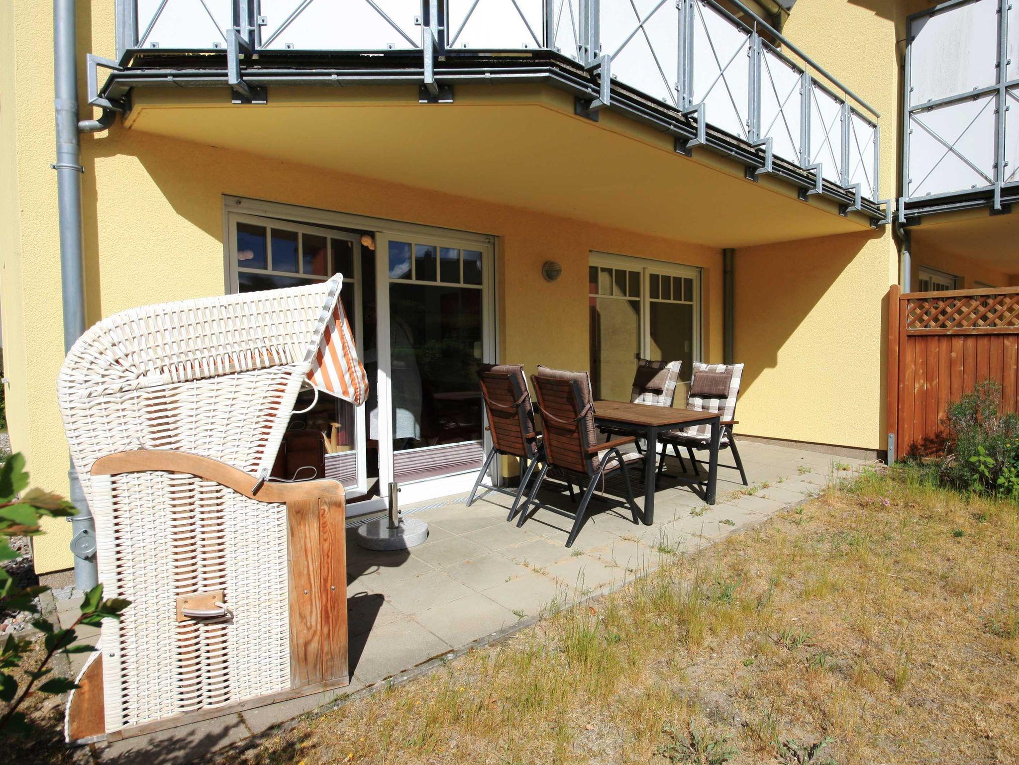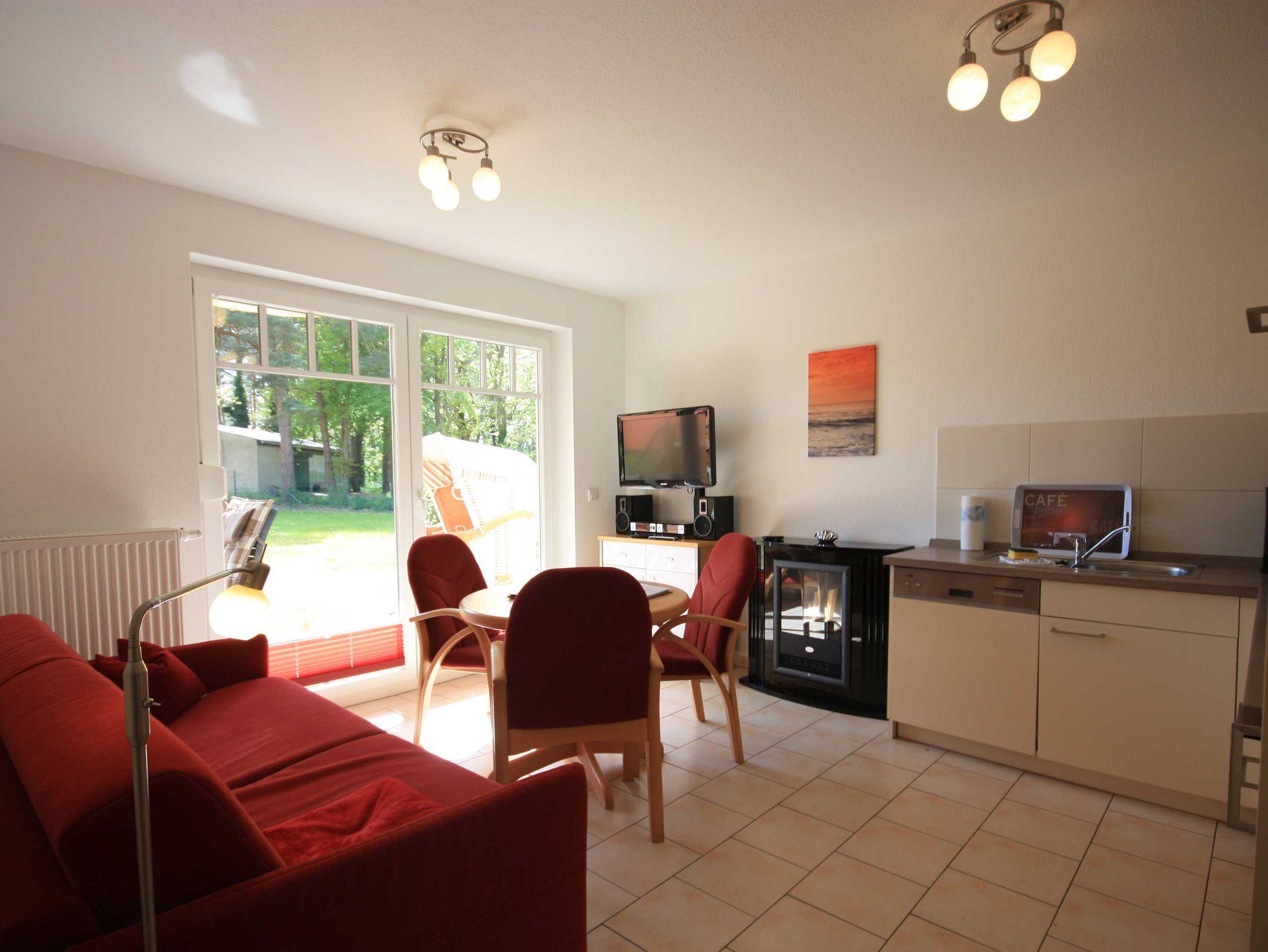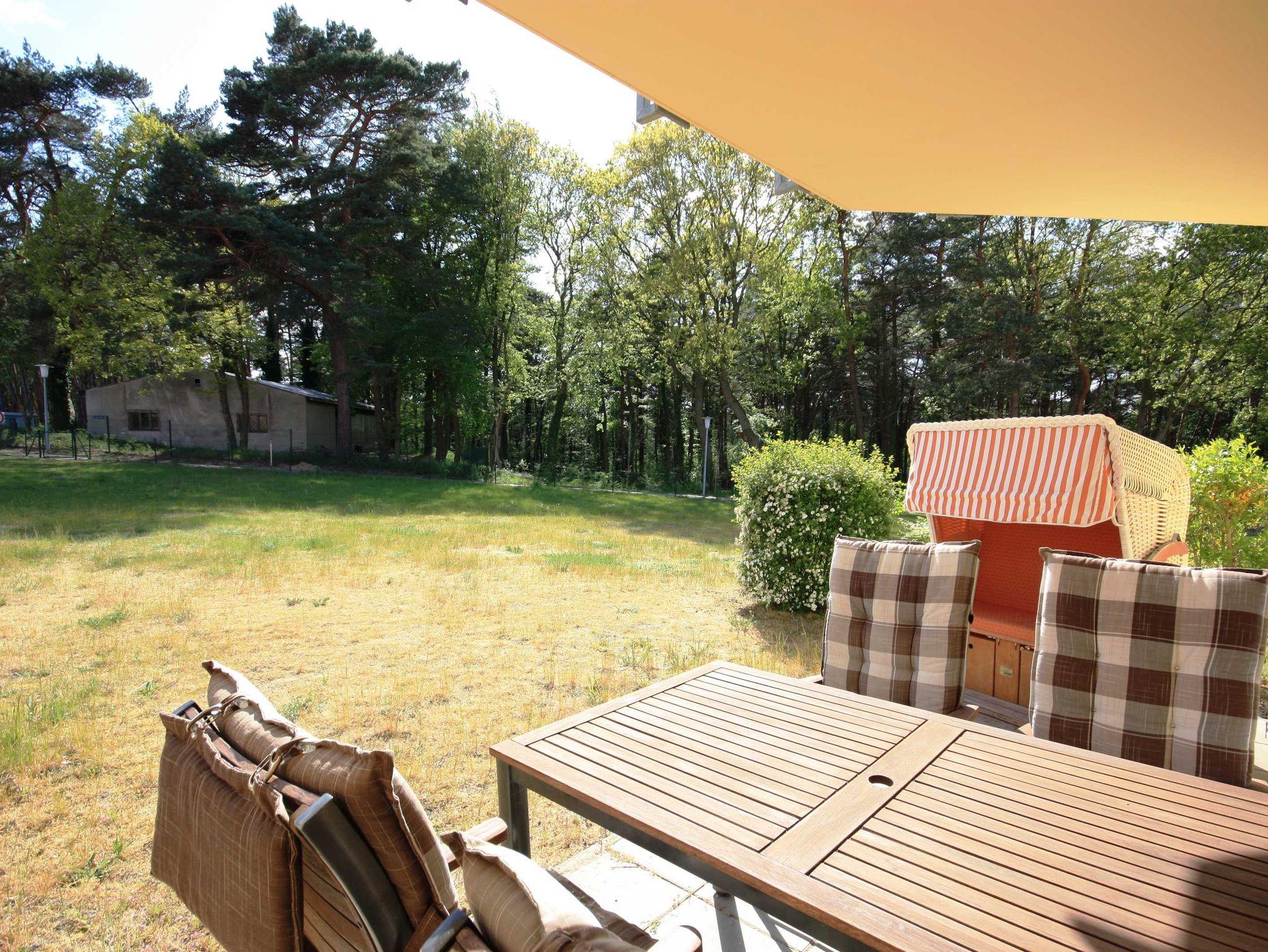 Moderne Ferienwohnung im Ferienpark Streckelsberg nahe Ostseestrand mit Terrasse und Blick auf den Küstenwald.